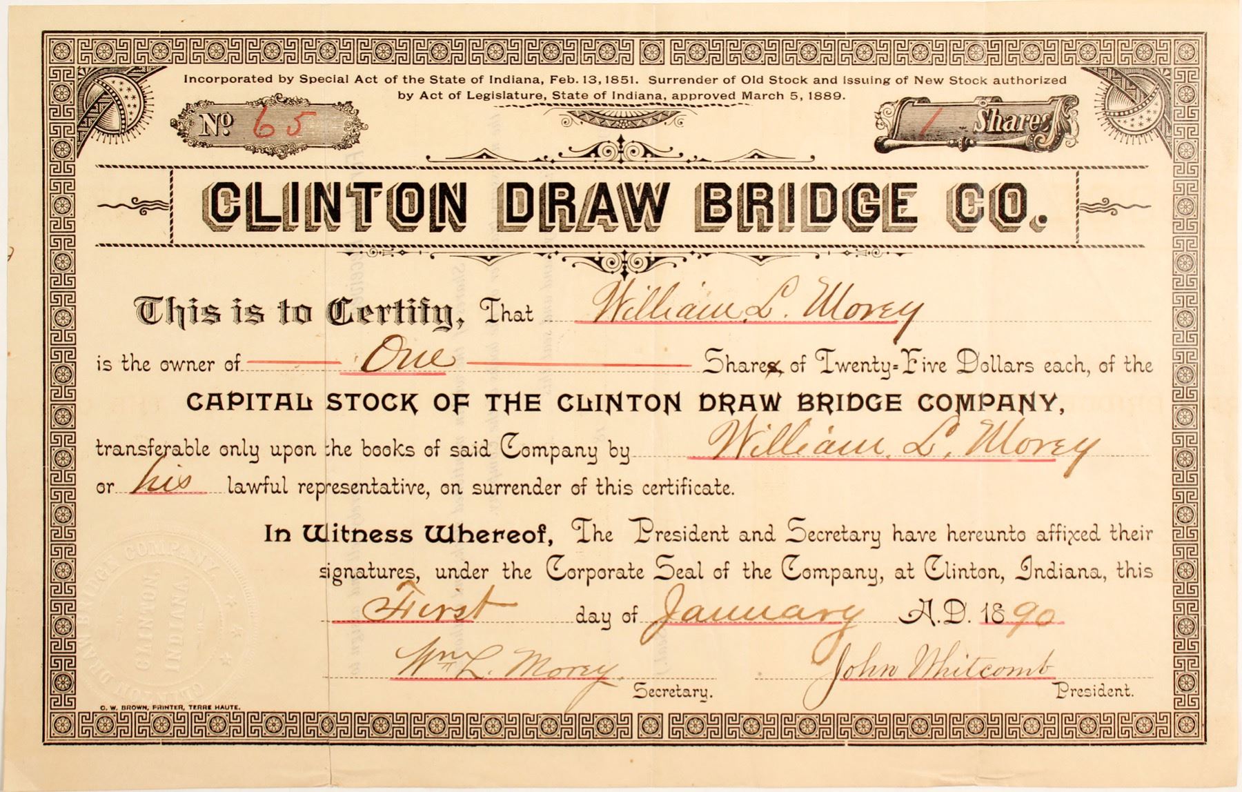 I/U #65 William Morey 65 shares 1890 signed by President Whitcomb. Inc in 1851. Prag Collection. State: Indiana City: Date: 1890 HWAC# 83466