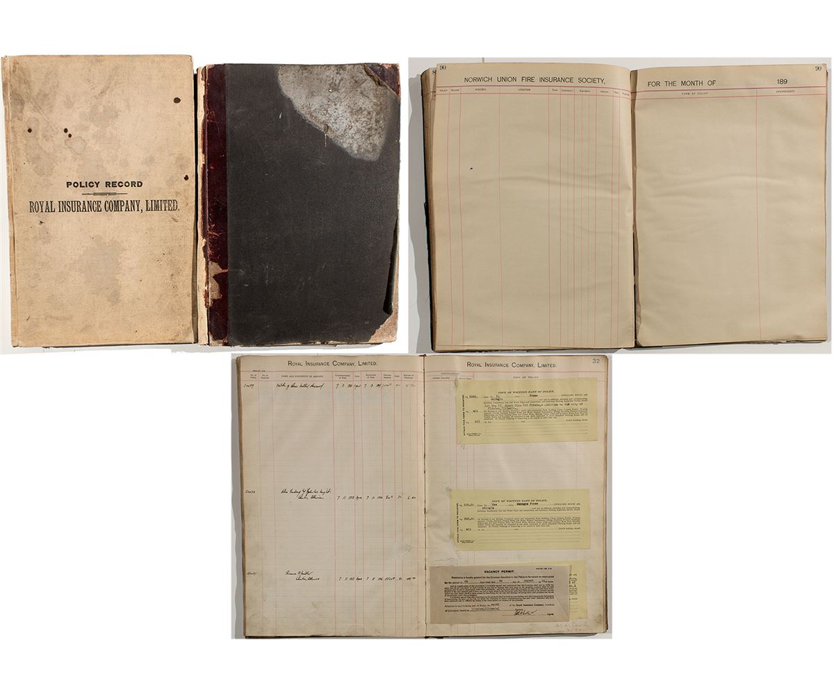 Lot of two insurance ledgers 1.) Norwich Union Fire Insurance Co. operating out of Clinton, ILL 2.) Royal Insurance Company. One of the volumes still retains both of its original cloth covers, while one is missing the back cover board. Both volumes measure 11”x 17” and contain very clear handwritten entries.