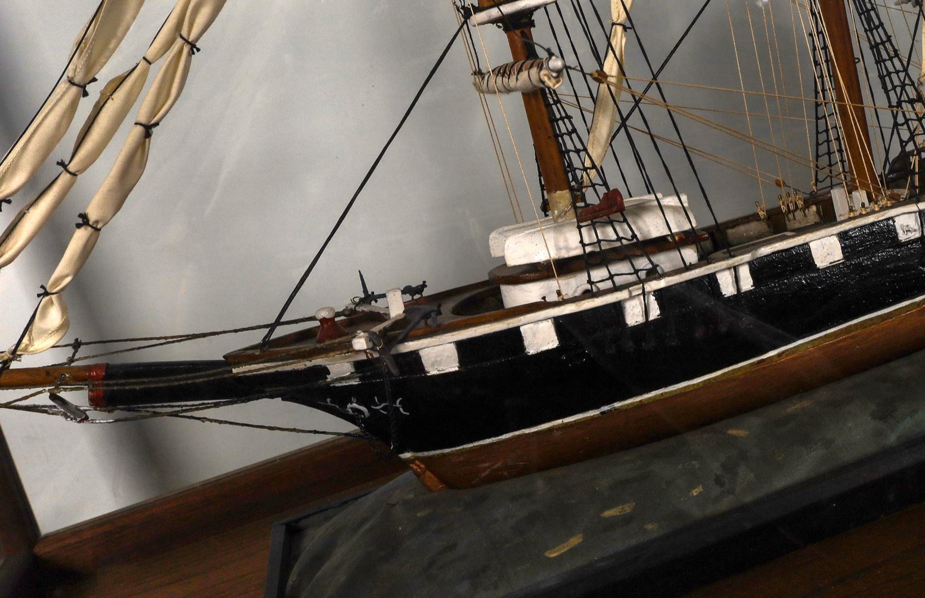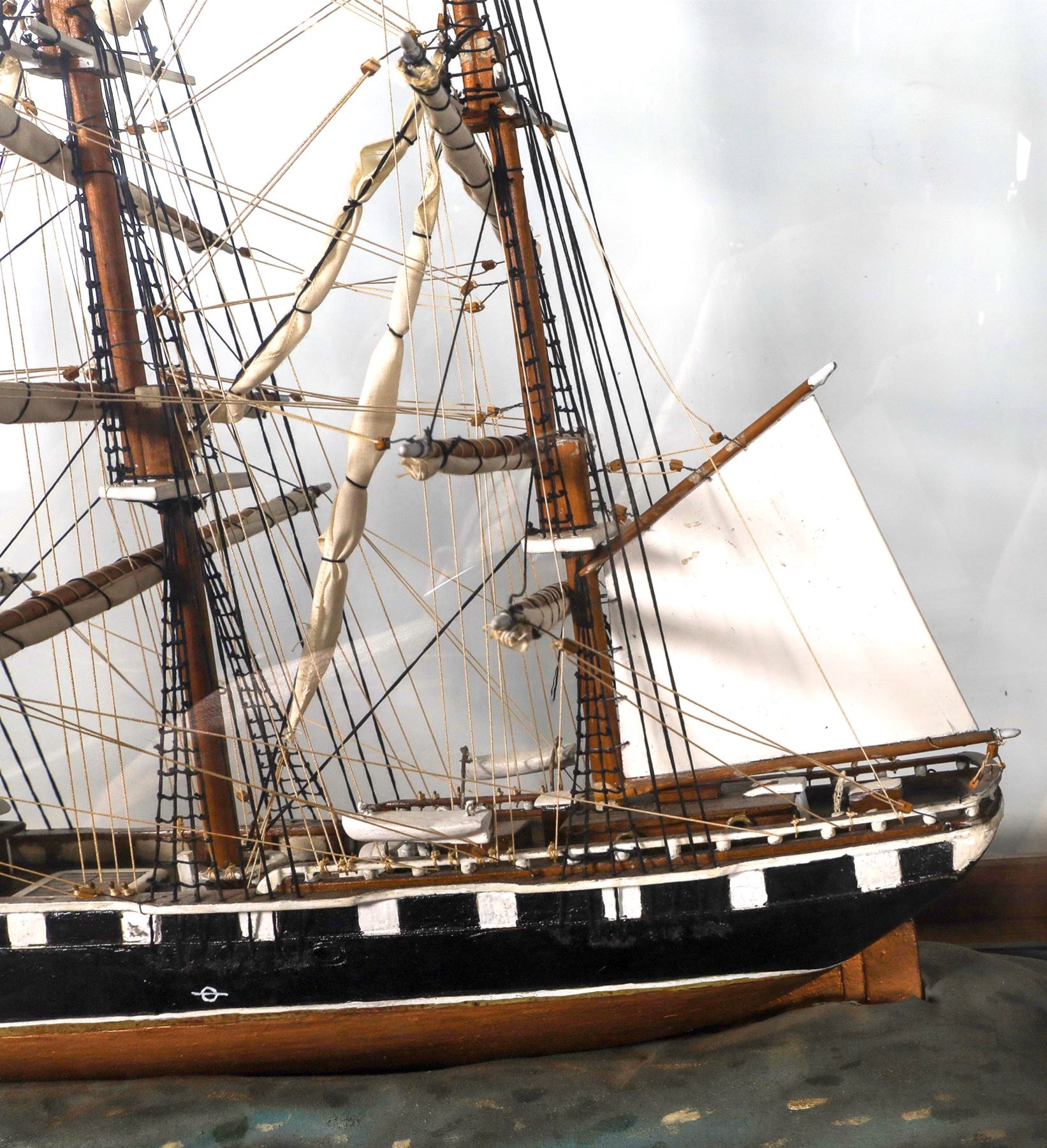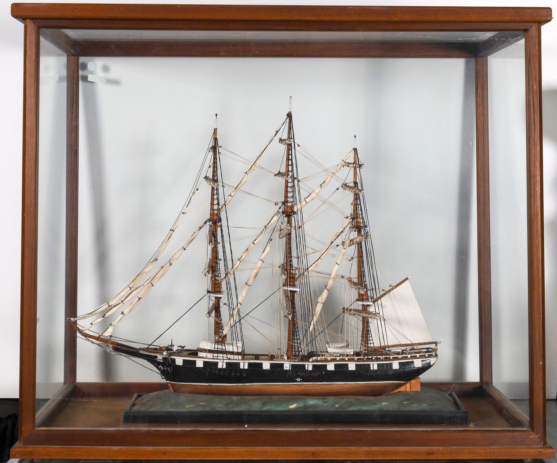 Fully assembled, wood model Clipper Ship, hand-painted, 4 life boats, only spanker sail is open. Display case opens at top and measures approximately 28" tall X 34" wide x 18" deep. See Photos for detail. Clipper Ships filled the seas from about 1840 to the 1890s, with 200 Clippers recorded rounding Cape Horn in 1852. Over time Iron-hulled sailing ships replaced wooden clippers. This ship is a typical example of Clipper Ship models assembled from kits that have been popular since the 1960s and 1970s. This type of glass and wood display case is easily worth the opening bid.