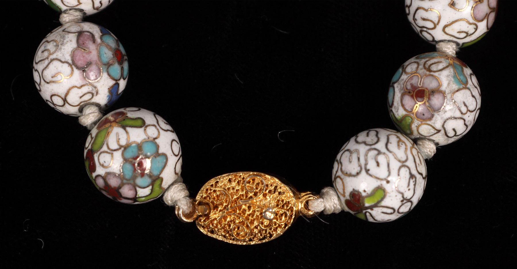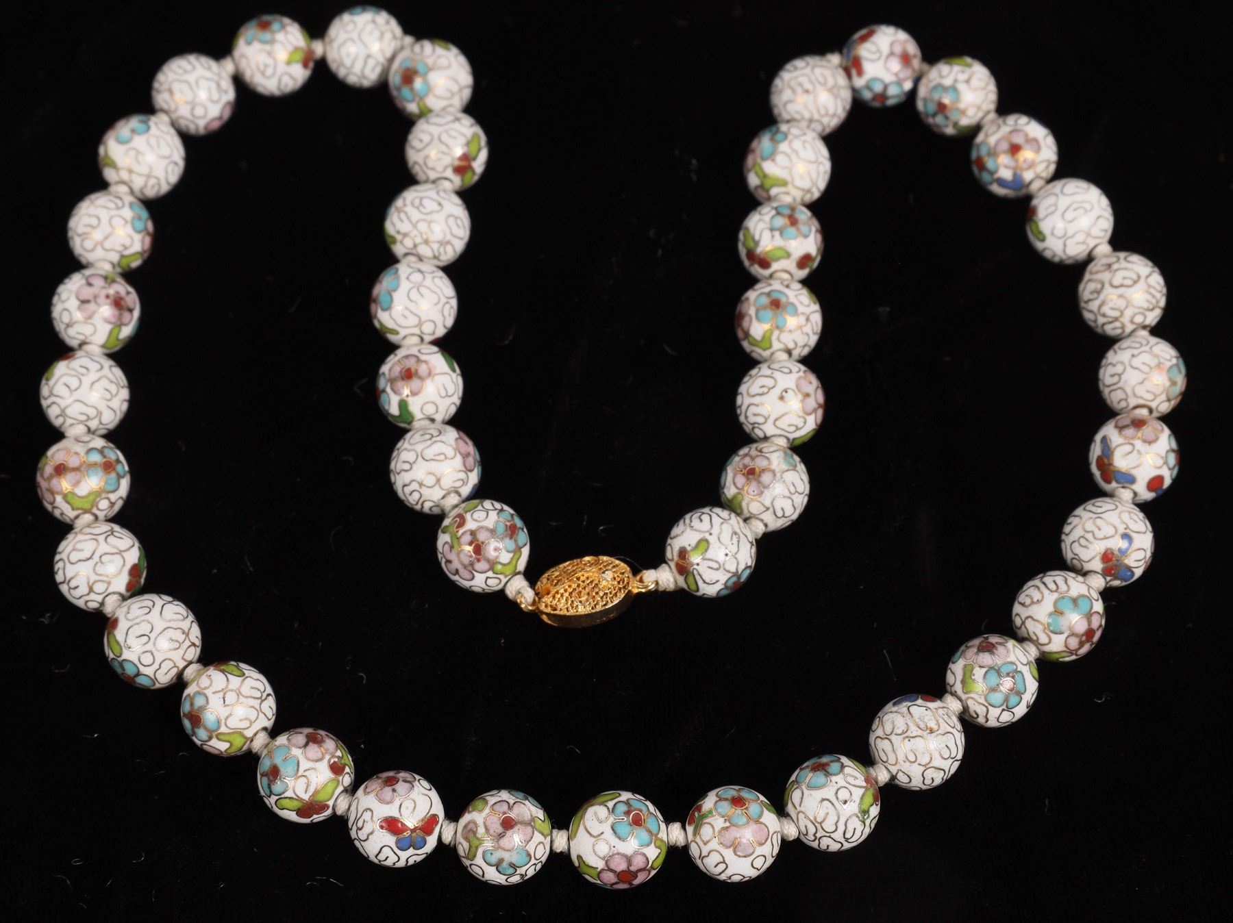 Beautiful vintage white cloisonne floral enamel hand-knotted beaded necklace. 24" length. Excellent condition.