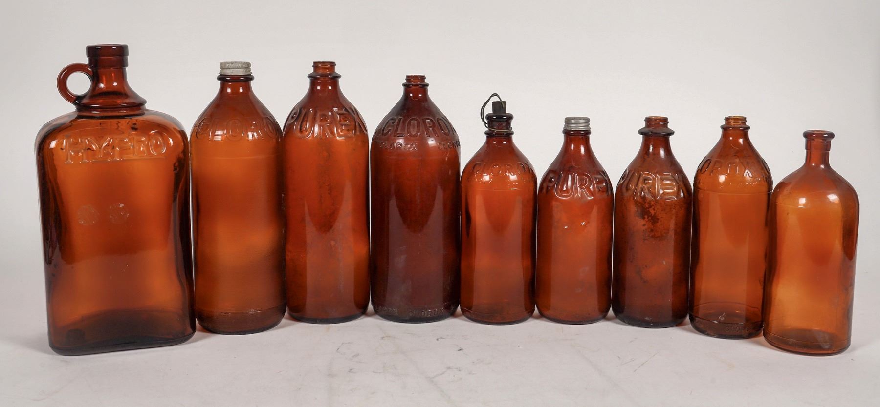 6 amber Clorox bottles-1 small lip chip and 1 large lip chip, 8-9.75", plus 1 2 quart Hypro and 2 Purex. No other apparent chips or cracks.