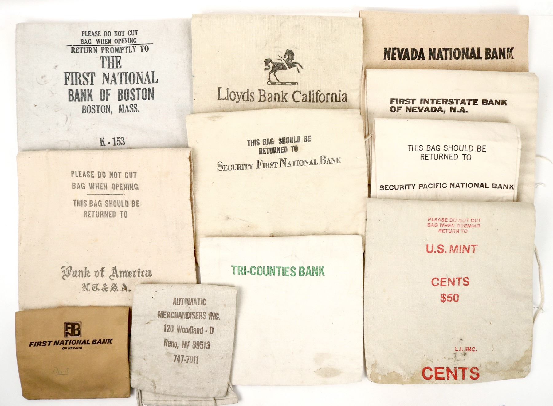 11 cloth bank bags, 10x6.5" to 19x11". First National Bank of Nevada, Bank of America, Lloyds Bank California, Security Pacific National Bank, First Interstate Bank of Nevada, Nevada National Bank, Tri-Counties Bank, First National Bank of Boston etc.