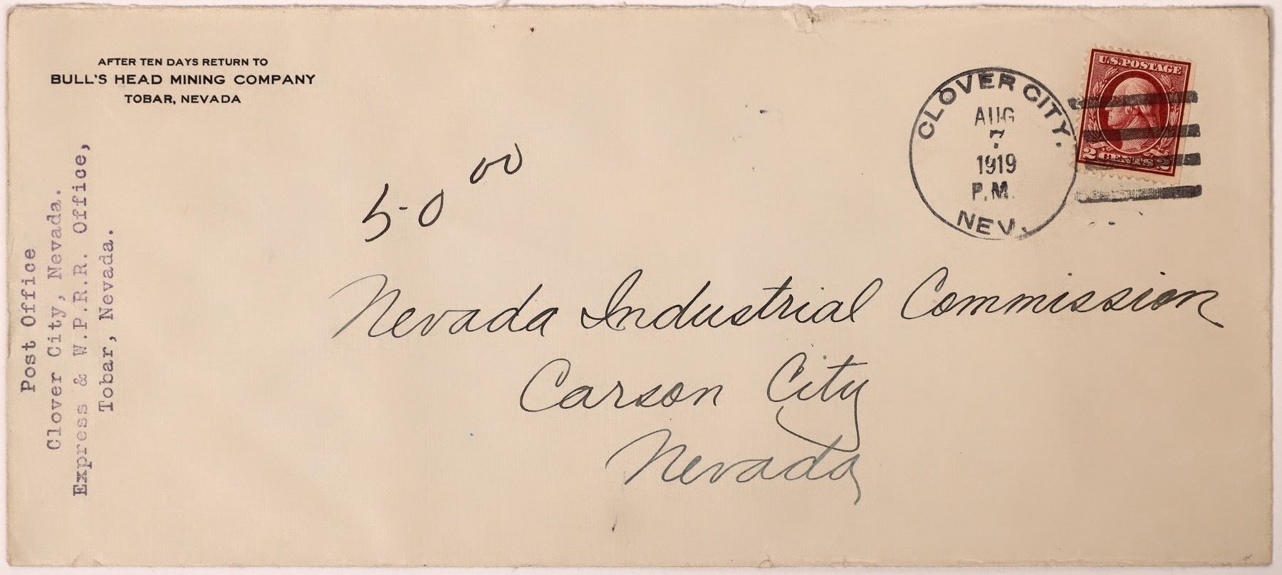 1920. Rarity-8. Excellent strike. Legal size cover. Corner cover of the Bull's Head Mining Company. Stamped on cover is "Post Office / Clover City, Nevada / Express & W. P. R. R. Office / Tobar, Nevada." Includes a short history of Clover City (Tobar), Notes on the Bull's Head Mine (Ada H Mining Company). City:Elko Co. State:Nevada Date:1920