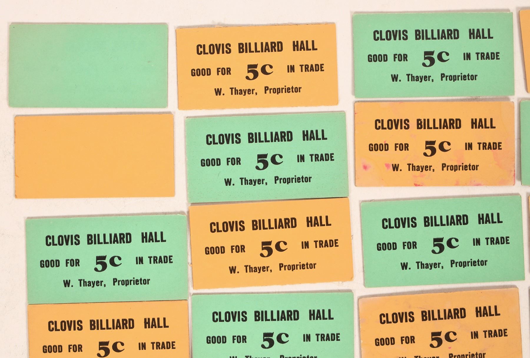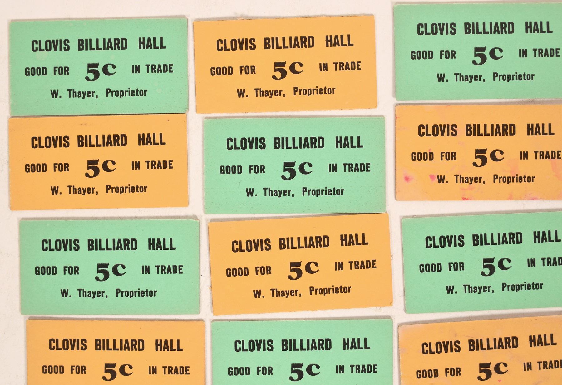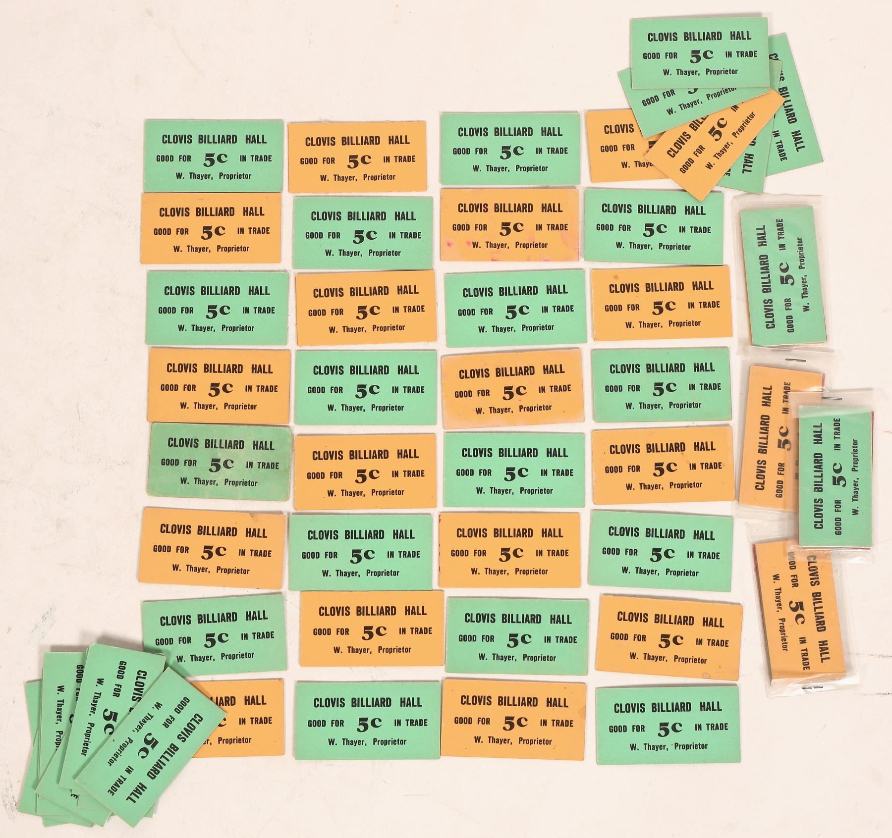About 50 cardboard tokens from the Clovis Billiard Hall. Good for 5 or 10 cents in trade. Green, red and yellow. W. Thayer, Proprietor. The tokens are 61 x 32 mm. [Clovis] [California]