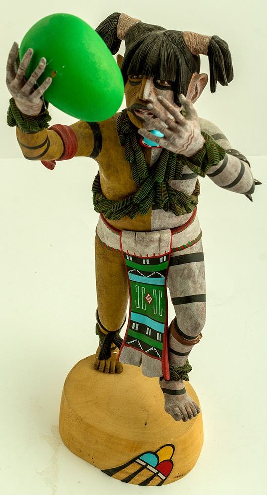 Clown (Koshare) by A. L. Sahmie. 16" h x 5.5" w x 6" d. This fabulous koshare has been broken and repaired. The price reflects that. State:Arizona City:Hopi Date: ID# 49305