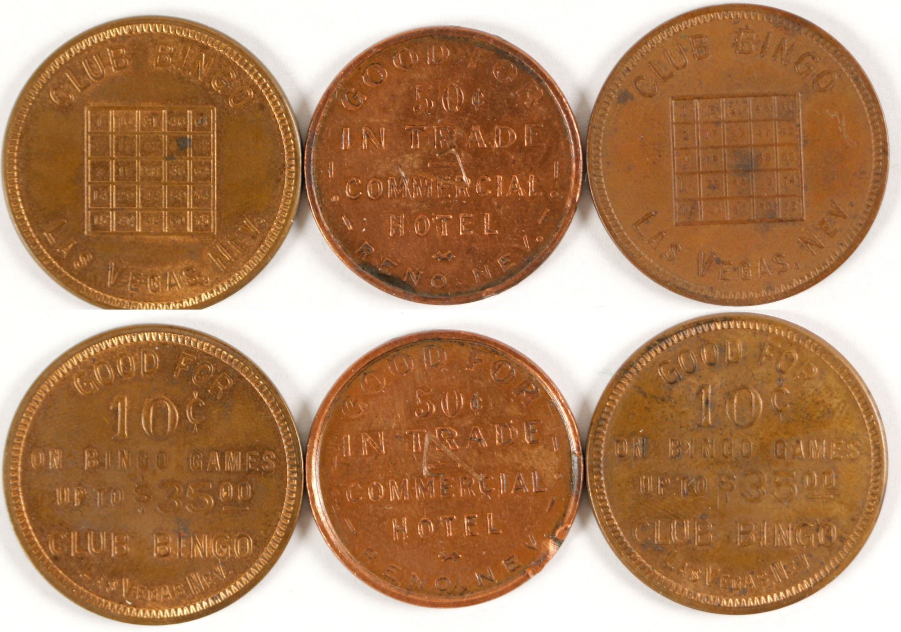 Lot of three tokens. 1) Obv.: Good For / 50c / In Trade / Commercial / Hotel / Reno, Nev.; Rev.: same. stamped "7" on one side, "Z" on the other. C,rd., 30 mm. 2 & 3) Obv.: Club Bingo / Las Vegas, Nev.; Rev.: Good For / 10c/ On Bingo Games/ Up to $35.00 / Club Bingo / Las Vegs, Nev. Br., rd., 33 mm.