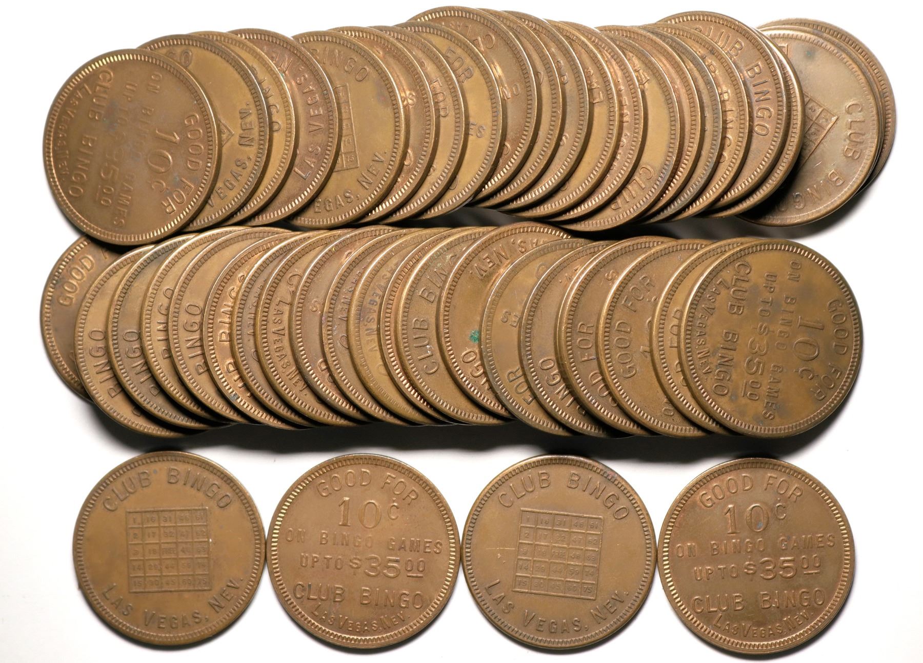 Lot of 47 Club Bingo, Las Vegas tokens, c1947-52. 1-1/4 inch diameter, au+ tokens embossed with bingo game center obverse encircled by "CLUB BINGO/ LAS VEGAS, NEV. Reverse reads, "GOOD FOR 10c ON BINGO GAMES/ UP TO $35.00/ CLUB BINGO/ LAS VEGAS, NEV. Some worn. Club Bingo was open from 1947-‘52 on the Las Vegas strip.