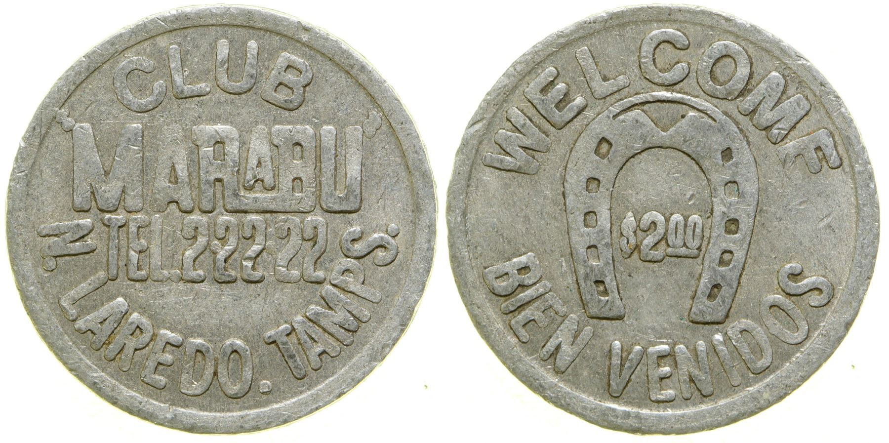 Obv.: Club / Marabu / Tel.22222/N. Laredo, Tamps.; Rev.: Welcome / Bien Venidos / $2.00. Wm, rd., 21 mm.