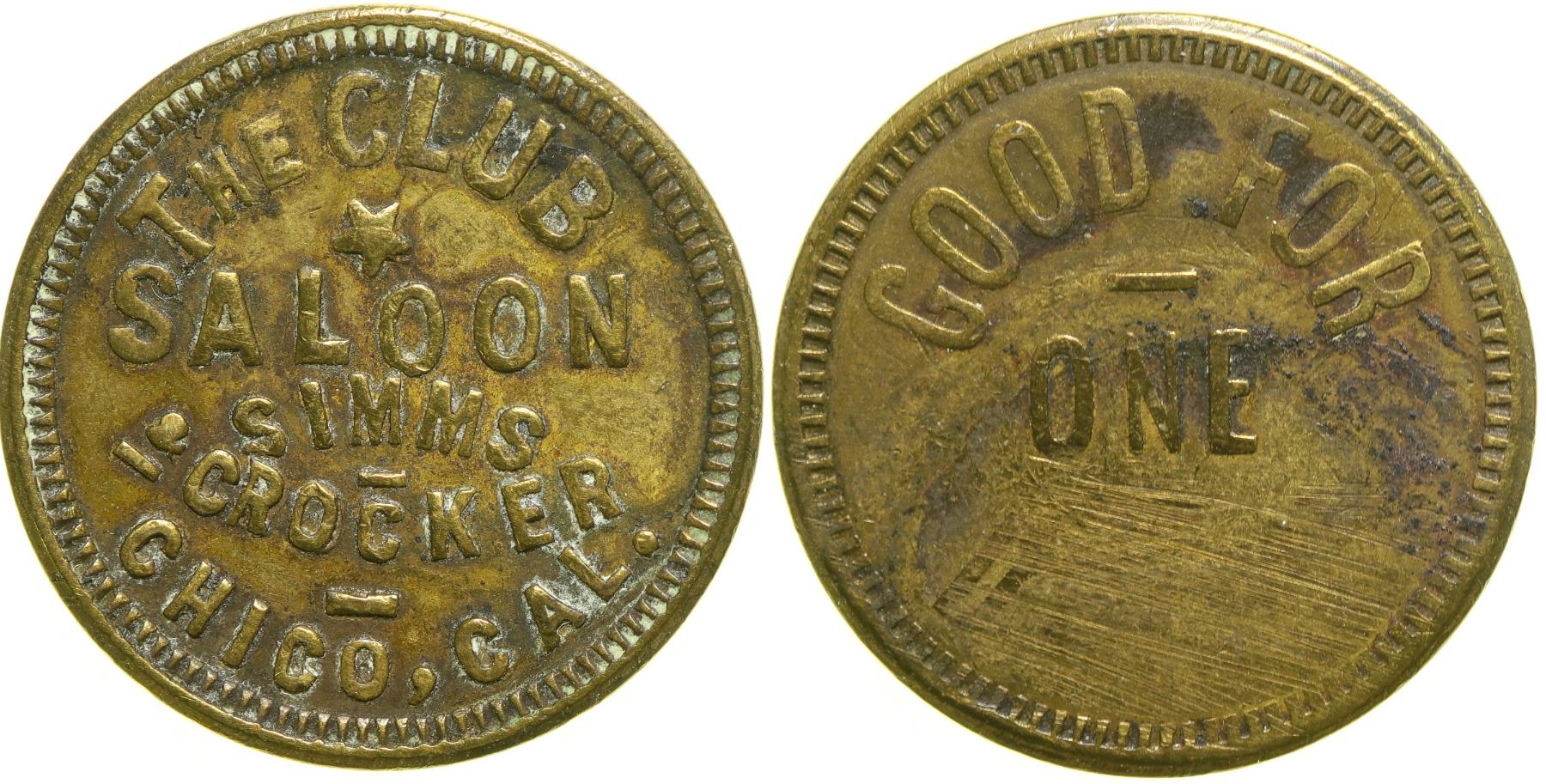 Obv.: The Club / Saloon / Simms / Crocker / Chico, Cal.; Rev.: Good For / One / (scratched out). Br. rd., 21 mm, R6. Salvatore Falcone Collection.