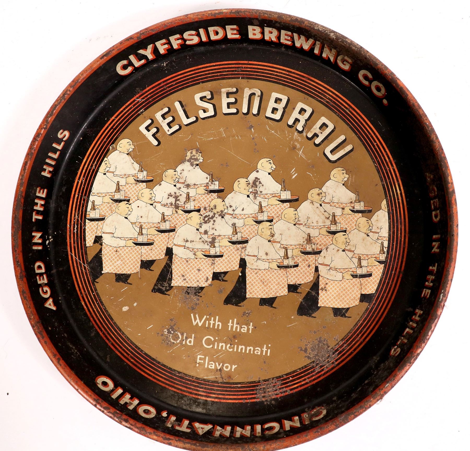 This beer tray is from the "Clyfside Brewing Co./ Cincinnati, Ohio/ Aged in the Hills/ Felsenbrau/with that old Cincinnati flavor". It measures 12 in. across, the base depicts many waiters serving beer, oxidized base, and edge. Pre-pro. Cininnati Ohio