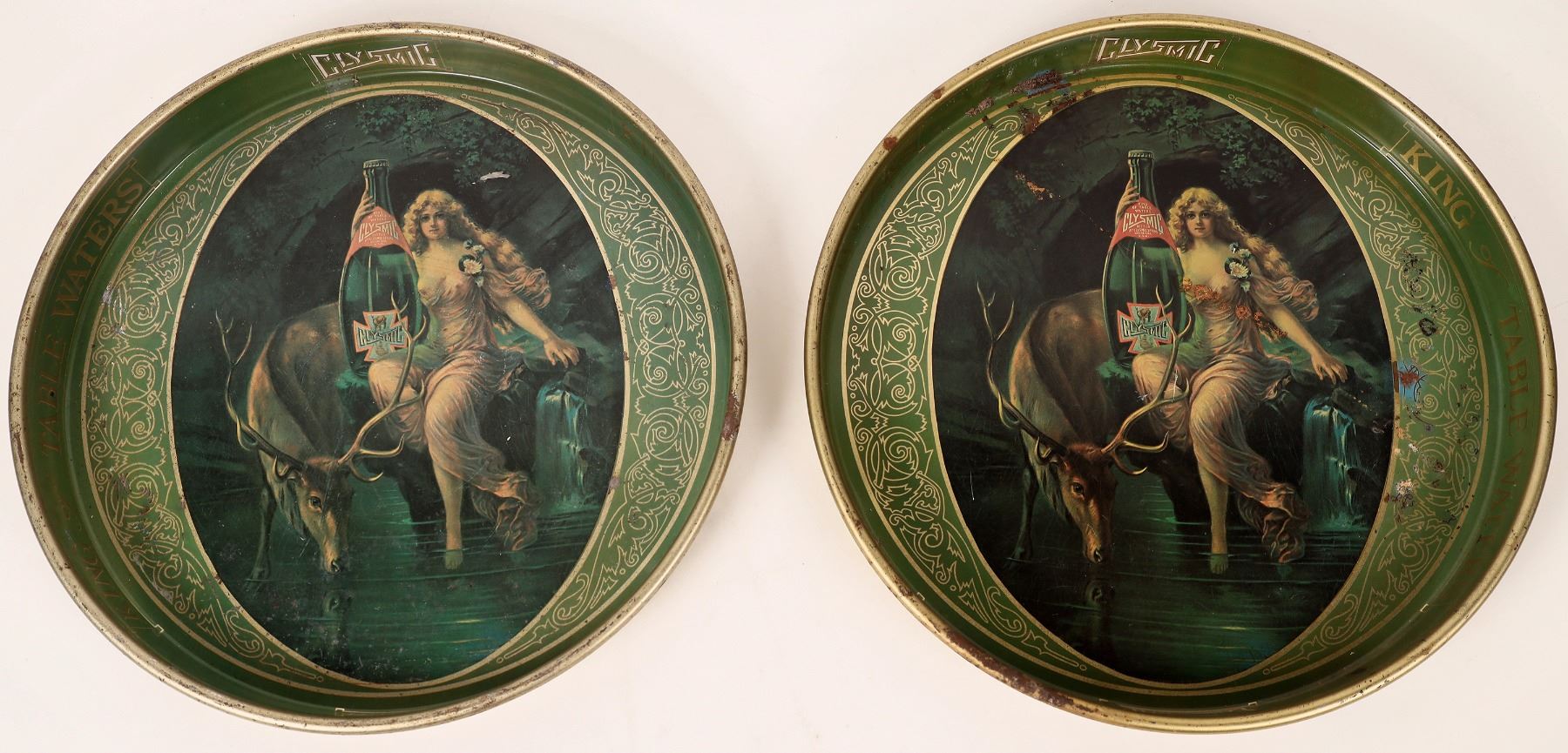 2x 14" Clysmic Table Waters/King of Table Waters trays. Mineral spring water company from Wisconsin that started in 1868. Some rust and chips, please inspect. Wisconsin