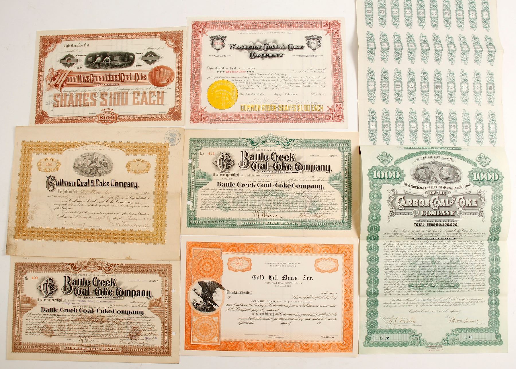 6 Coal and Coke stock and bond certificates. 1) Unissued Mt. Olive Consolidated Coal and Coke cert. # 489. printed: American Bank Note Co. N.Y. 2) Unissued Gold Hill Mines, Inc., cert #756 3) 100 shares Western Coal & Coke Co, cert. #1732 issued to J.J. Helby on Feb 26, 1917, gold raised co. seal. 4) 1 share, cert. # 180 issued to Jos Thors Esq. on July 29, 1909, raised co. seal. 5) 8 assigned shares Battle Creek Coal and Coke Co cert. # 424 issued to Nellie Baker Morgan on Dec 7, 1925. 6) 8 shares of Battle Creek Coal & Coke Co. cert #429 issued to Daniel Baker, Jr. on Sept 8, 1922 7) 1st Mortgage 5% Sinking Fund Gold Bond, cert #72. Principle due October 1, 1955 with 94 coupons. . Ken Prag Collection