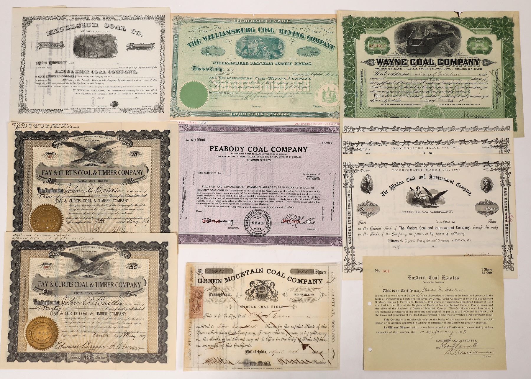 Lot of 11. 1) Green Mountain Coal Company. Issued in Philadelphia in 1864. "Middle Coal Field." Pen cancelled. Small coal train vignette at bottom. Revenue stamp at left. 2) Madera Coal & Improvement Company. Three certificates signed by the president, but not issued. c.1860s. 3) Wayne Coal Company. 1923 stock with great coal train vignette! 4) Fay & Curtis Coal & Timber Company. Two stocks issued in 1919. Many tears. 5) Excelsior Coal Company of Oskaloosa, Iowa. Unissued. 1870s. Mining vignette. 6) Peabody Coal Company. Specimen stock. 7) Williamsburg Coal & Mining Company. Franklin County, Kansas. Unissued, 1870s. Coal mining vignette. 8) Eastern Coal Estates. 1918 certificate.