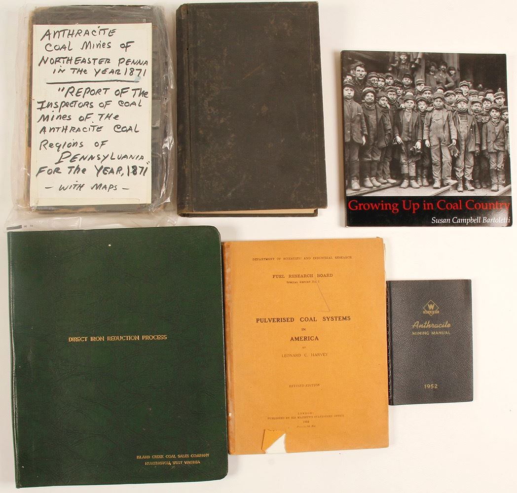 Six reference works on coal mining. Includes Pulverized Coal Systems in America 1922, mining manual 1952, Report of the Bureau mines from Pennsylvania 1898, Anthracite Coal Mines of Northeastern Pennsylvania 1871, Highland Creek Coal sales company, etc.