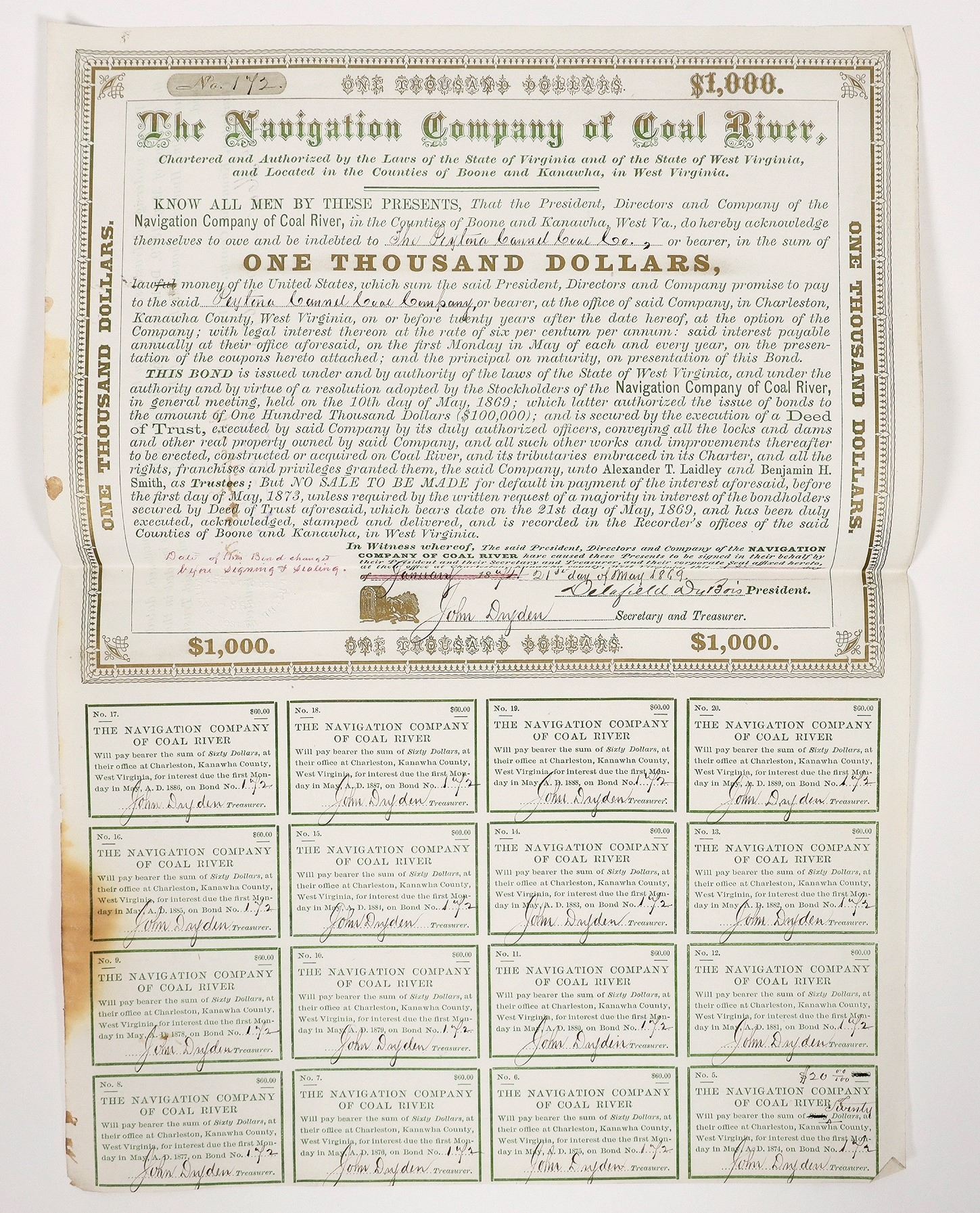 A bond certificate from the Navigation Company of Coal River, made out to the Peytona Cannel Coal Company in 1869. Signed by president Delafield DuBois and treasurer John Dryden with an embossed company seal. Uncancelled. 16 bond coupons intact, each signed by Dryden. Rounded/worn corners and some prominent foxing on the left edge of the cert.