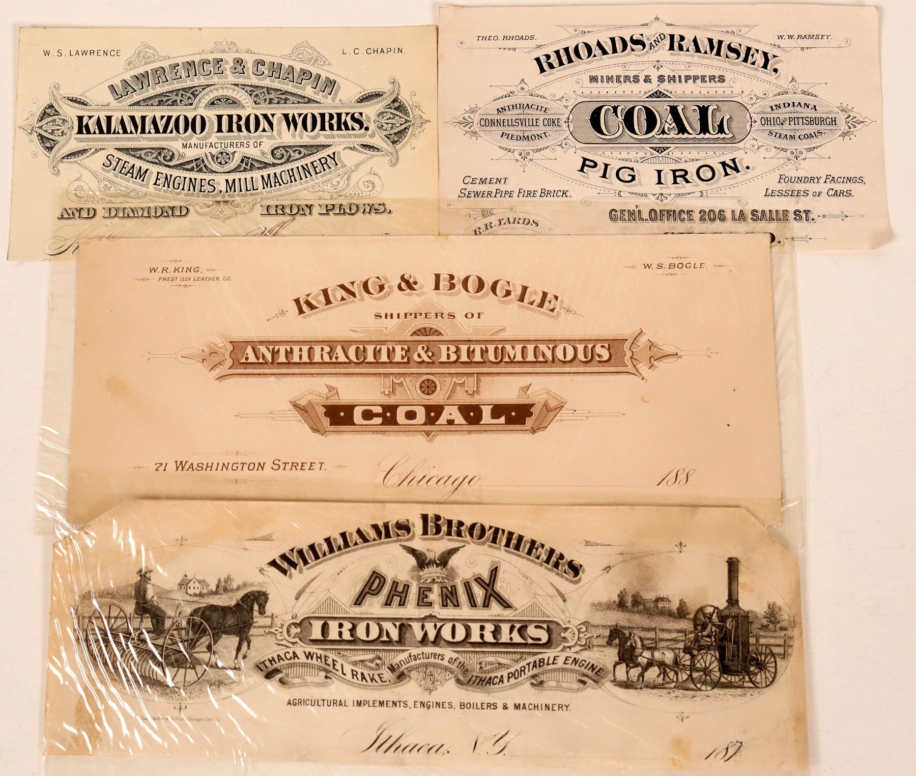 Lot of four printers' proofs printed by Shober & Carqueville Litho. Co., Chicago, c1870-1888. Includes two advertisements for coal companies, and two for iron works companies. All in fine condition, with decorative designs; one with vignettes/illustrations of an Ithaca wheel rake and portable engine from the 1870s. See photo for details.