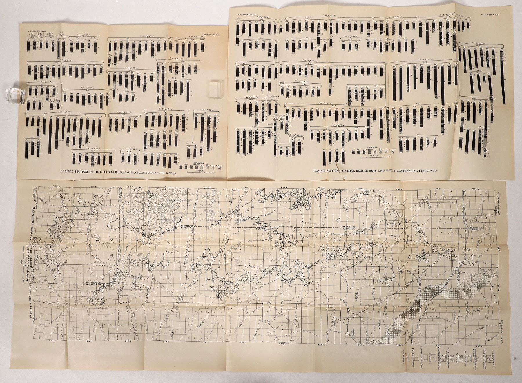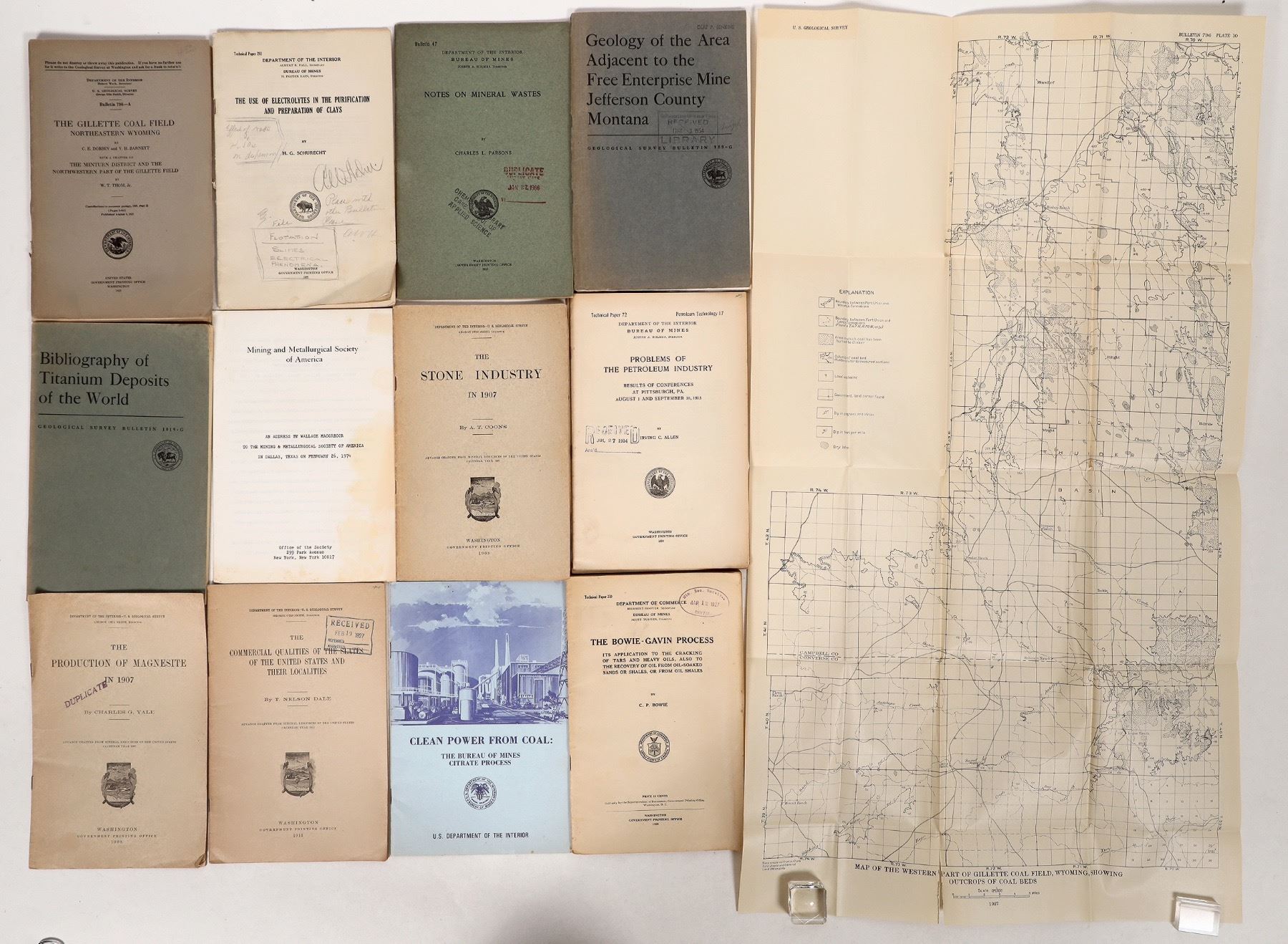 Collection of 17 booklets published by the Department of the Interior-U.S. Geological Survey and Bureau of Mines, c1908-70s. Includes titles such as: "The Production of Magnesite in 1907"; "The Stone Industry in 1907"; "The Commercial Qualities of the Slates of the United States and their Localities," 1913; "Notes on Mineral Wastes," 1912; "The Gillette Coal Field - Northeastern Wyoming," 1927, with maps and graphs; etc. Please see photo(s) for details.