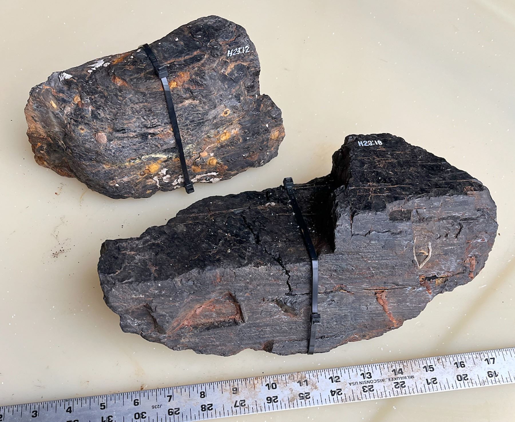These very large and impressive pieces of coal have both cleaved in two since recovery, with tie-wraps bound around them to preserve original position and integrity for storage and shipment. They both display well with the tie wraps removed.