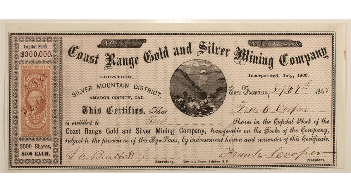 This is stock no. 133, it was issued to Frank Cooper on September 7, 1863 for 10 shares. It was incorporated July, 1863 and was located in the Silver Mountain District of Amador County. The printer is identified as Towne & Bacon Printers, San Francisco. There is a 25c United States revenue stamp on the left side. This company was not discussed in Holabird, 2001 nor is it listed in any other mining books from the time. It measures 9" x 3.95"and has some wear including rough sides.City: County: Alpine State: CADate: 1863