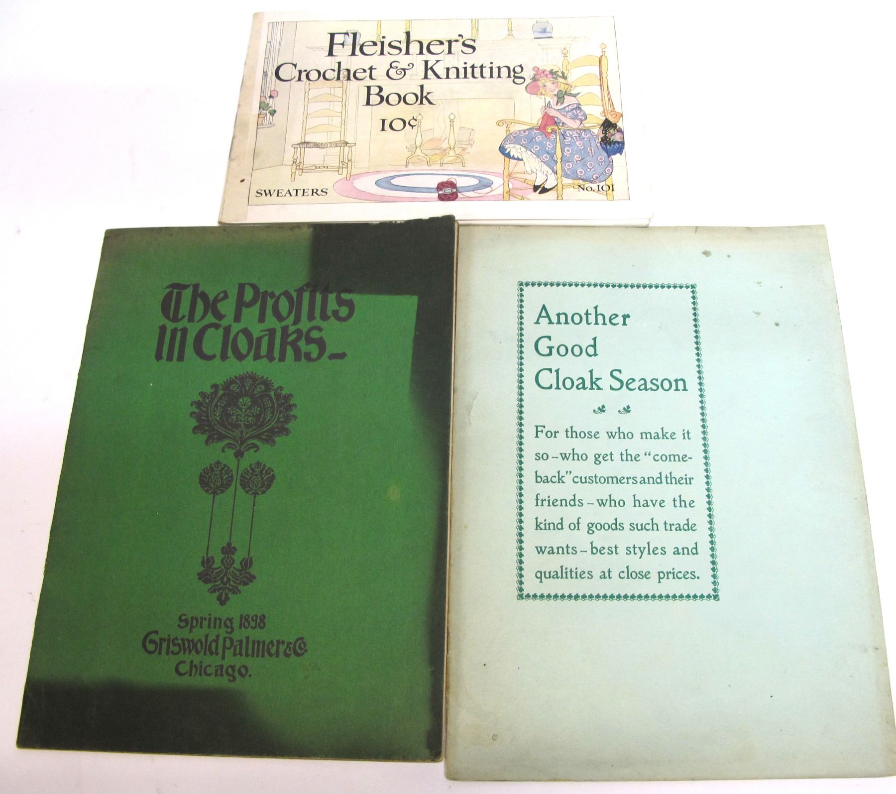 Another Good Cloak Season, spring catalogue 1897, Griswold, Palmer and Co. with b/w illustrations of ladies apparel, 16pp plus price list. 10.75" x 7.75". The Profits in Cloaks, spring 1898, Griswold, Palmer and Co. with b/w illustrations of ladies apparel, 20 pp 10.5" x 7.5", cover has toning. Fleisher's Crochet & Knitting Book, No 101 sweaters, 1919. 32 pp. Crochet instructions and b/w photos of ladies in outfits. 6" x 9". Fashion has really changed today!