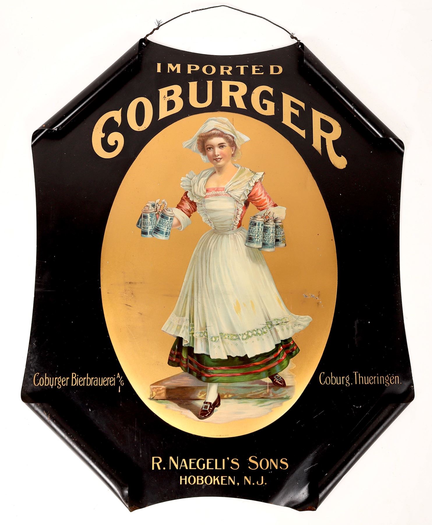 Very Early Beer Advertising sign! Reads: IMPORTED/ COBURGER/ Coburger Bierbrauerei Coburg. Thueringen./R. NAEGELI'S SONS/ HOBOKEN, N.J. Made by the Meek Co. in Coshocton, Ohio. Approx. 20 x 16" with curled corners. Very rare advertising metal sign in good condition featuring traditional beer maiden. See photos. The Meek & Beach Company was established by J. F. Meek in 1887 located in Coshocton, OH originally under the Meek Company name. Meek Co. started out producing advertising items such as school bags, grocers aprons, fans, and other smaller advertising items. The H. D. Beach Sign Company was founded by Henry D. Beach and was the result of a breakup of the Meek and Beach Company in 1901. Hoboken New Jersey c.1885-90