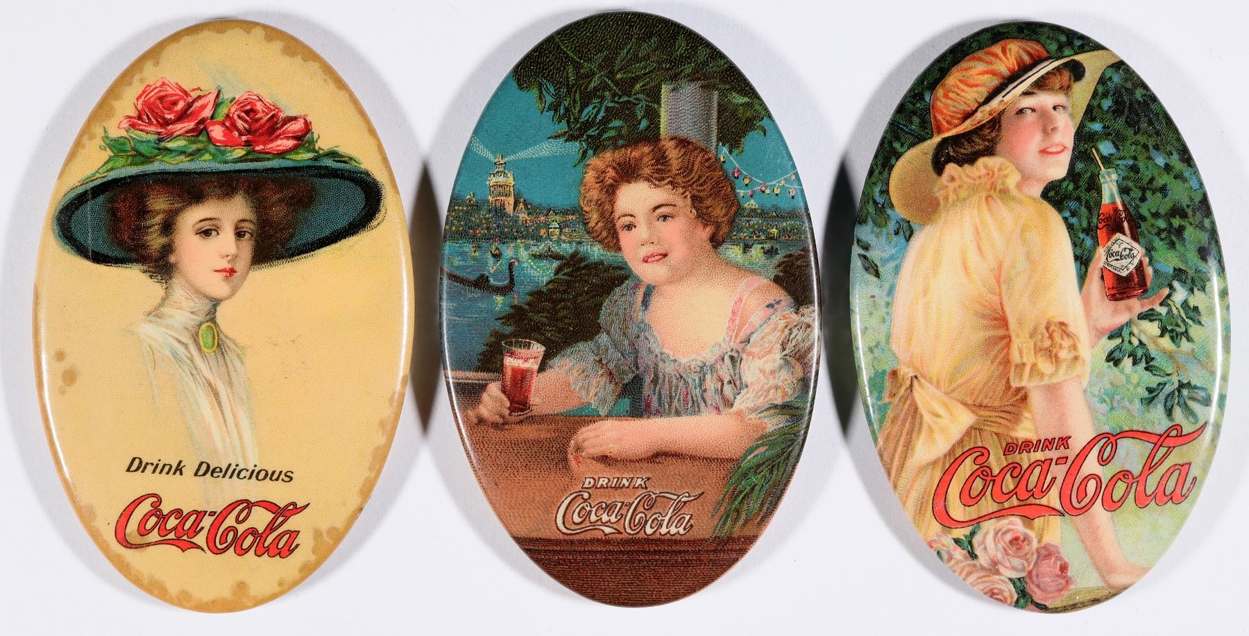 Three pocket mirrors with lovely ladies encouraging you to drink delicious Coca Cola. All are ovals, 44 x 70 mm. In the accompanying image, the far right mirror is labeled / THE WHITEHEAD & HOAG CO., NEWARK ,N .J. / along the crimped edge at the 6 o'clock position. The center mirror is labeled / J B CARROLL CHICAGO / at the 9 o'clock position and / DUPLICATE MIRRORS 5c POSTAGE COCA-COLA COMPANY, ATLANTA, GA / in the 6 o'clock position. The far-left mirror is labeled / DUPLICATE MIRRORS 5c POSTAGE COCA-COLA COMPANY, ATLANTA, GA / at the 6 o'clock position, and it also has / WHITEHEAD & HOAG CO., NEWARK, N.J. / at the 3 o'clock position. From the Ron Lerch collection.