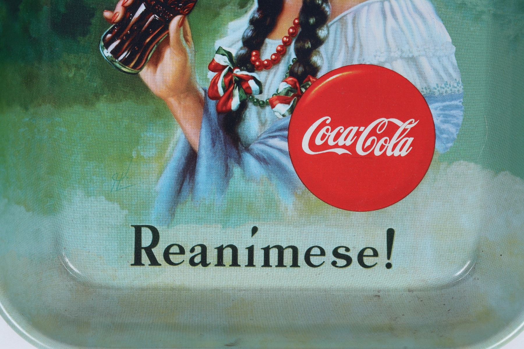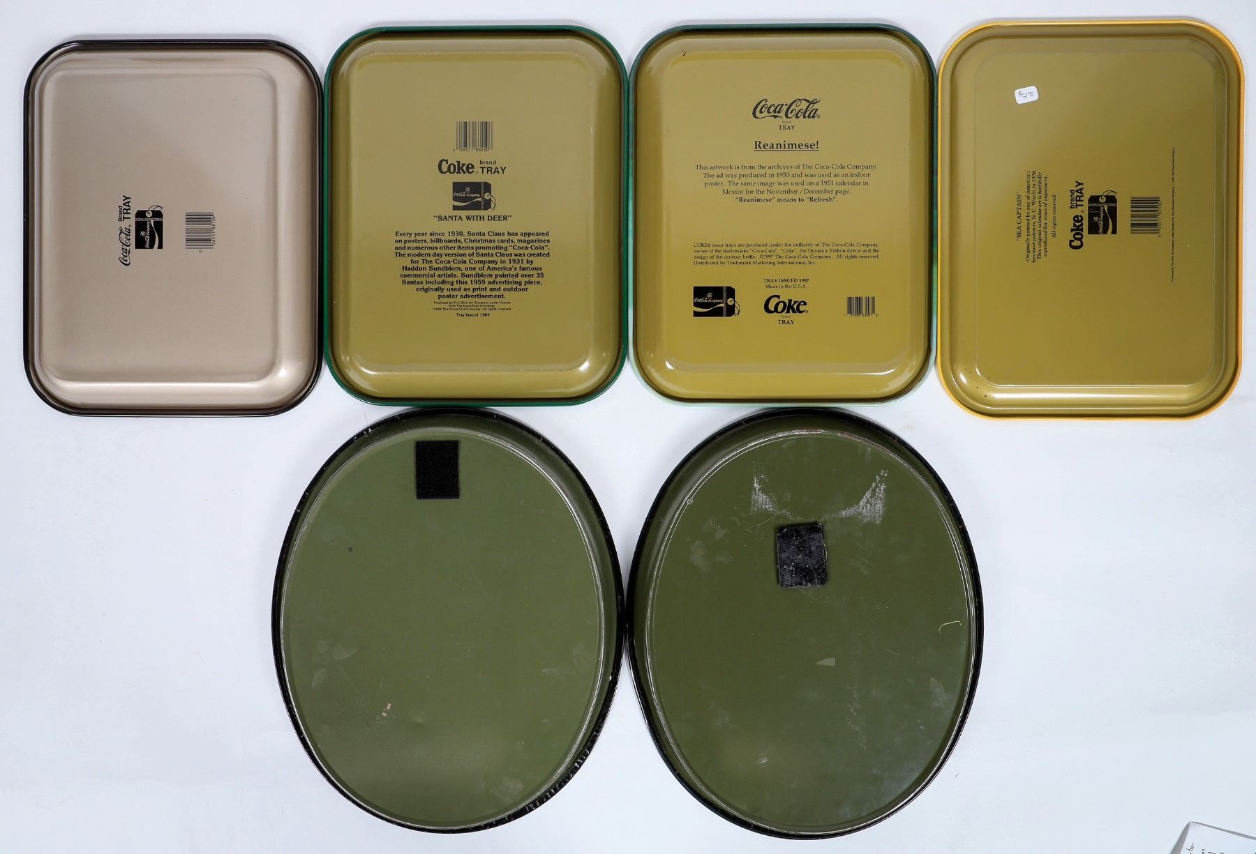 Four rectangular metal Coca Cola reproduction trays (10 x 13 inches). Two oval metal trays (15 x 12 inches).