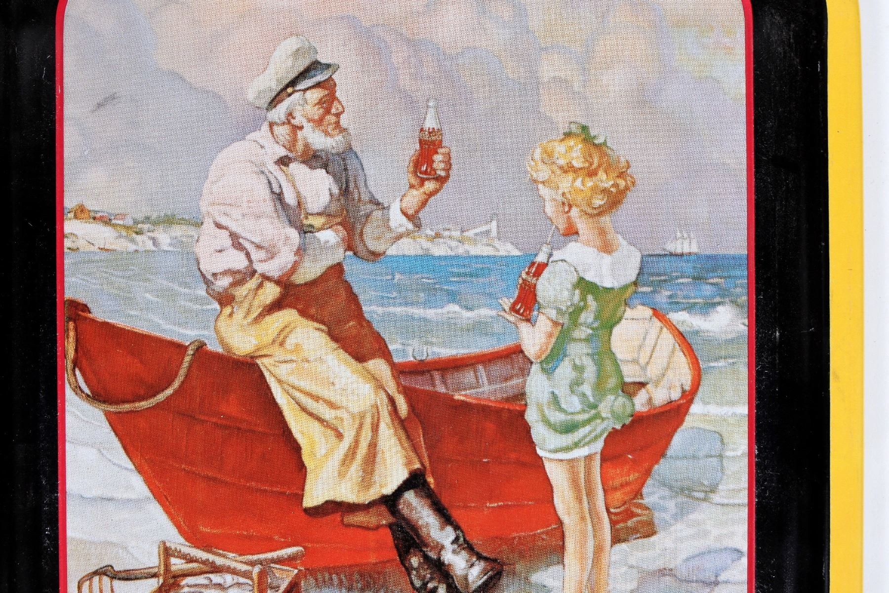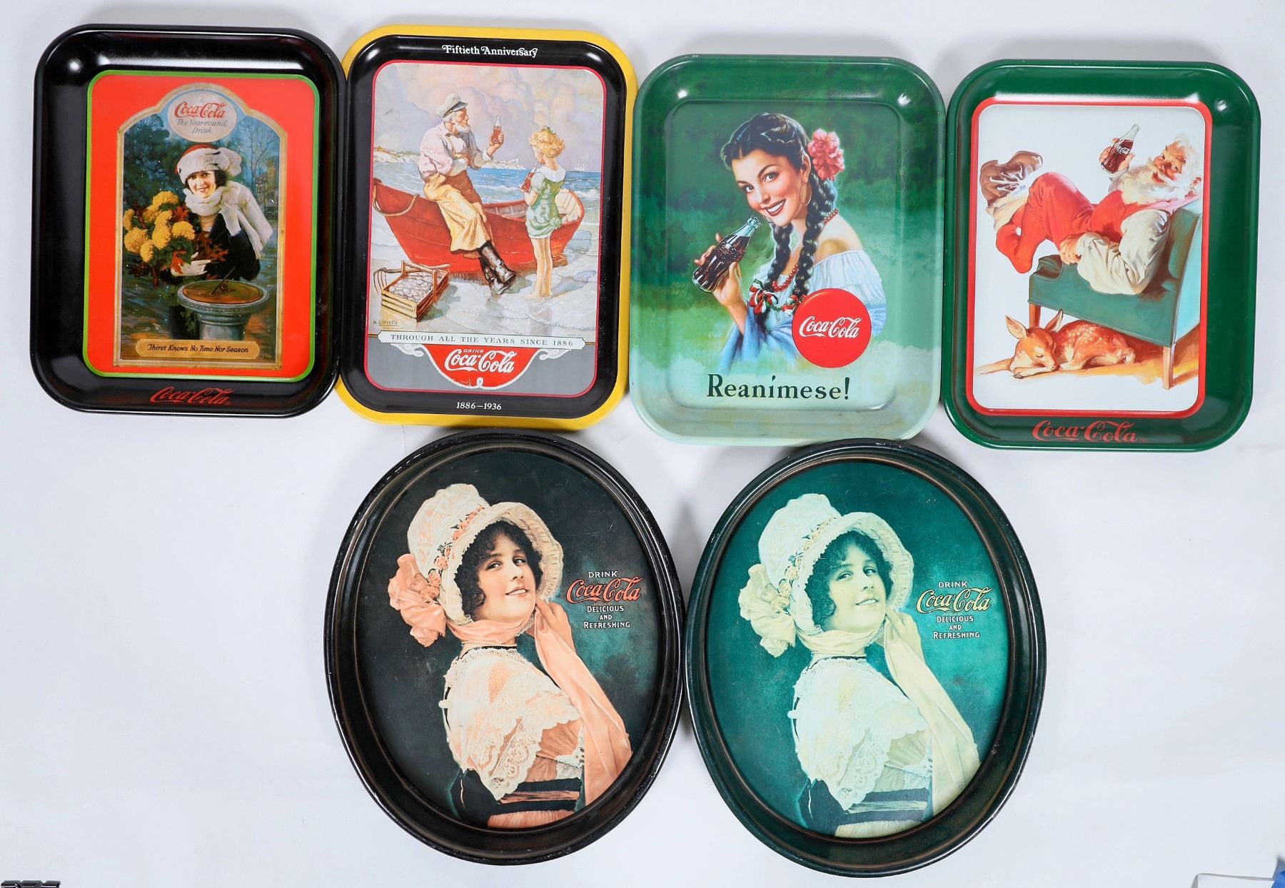 Four rectangular metal Coca Cola reproduction trays (10 x 13 inches). Two oval metal trays (15 x 12 inches).