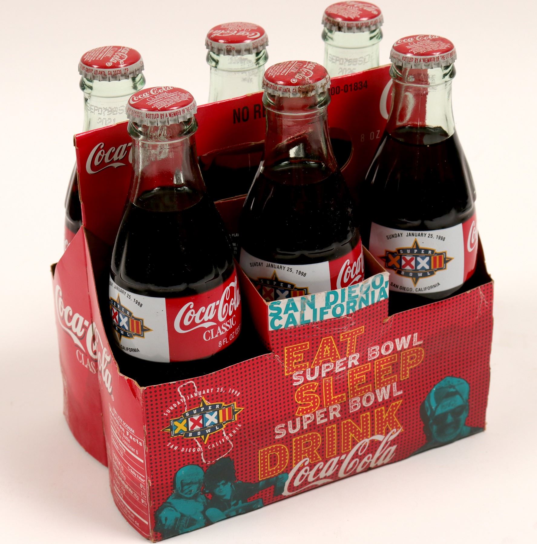 If you are a sports collector, here is a very nice item. It is a full , 6 pack of unopened Coca-Cola Bottles, in the carton. It is a special issue for the Superbowl XXX11 , which was played in San Diego, California. Really nice condition, and a nice item for your man cave. ( RH).