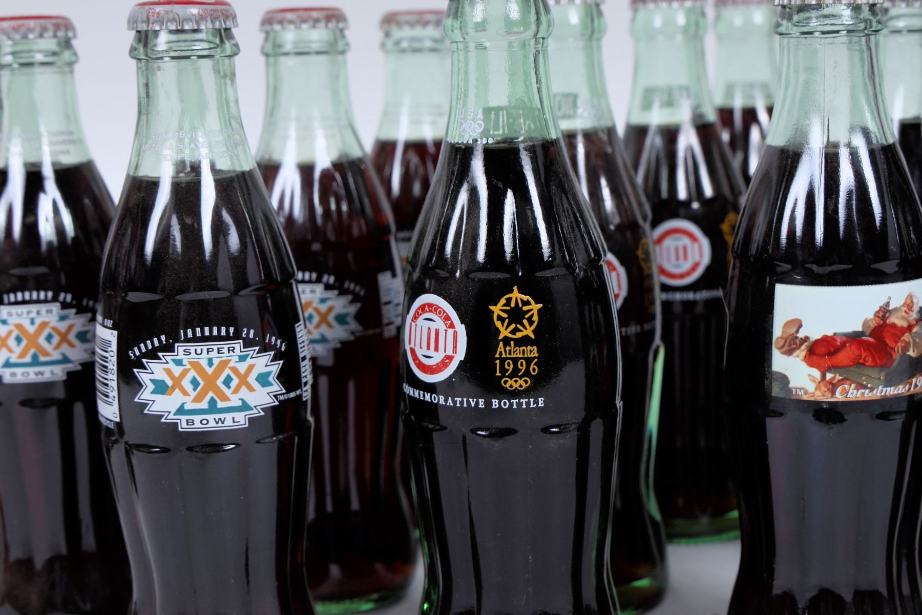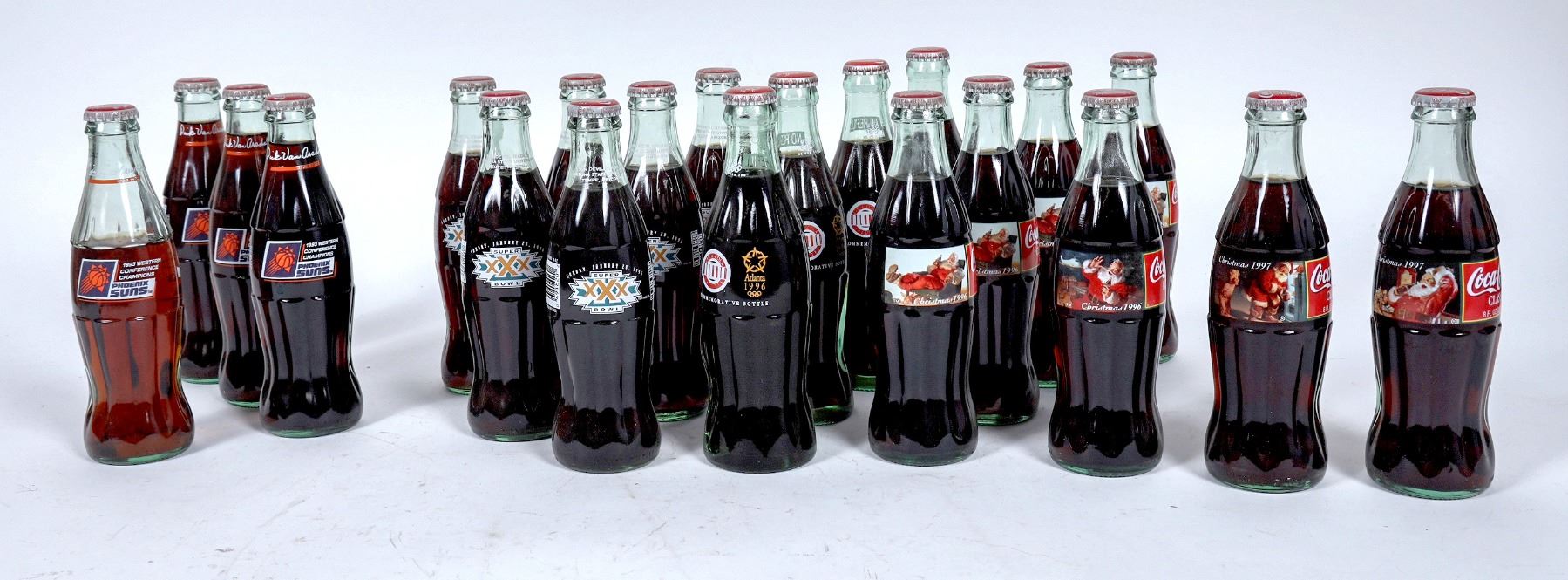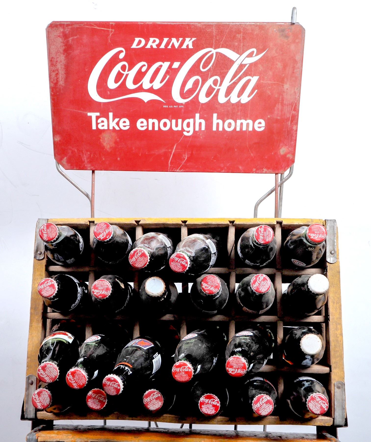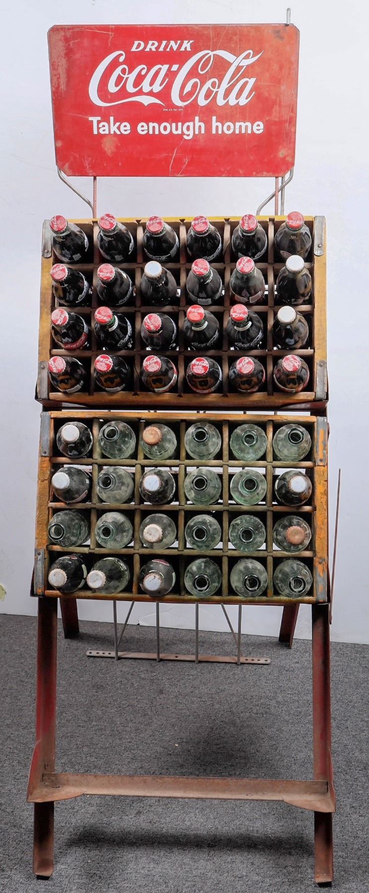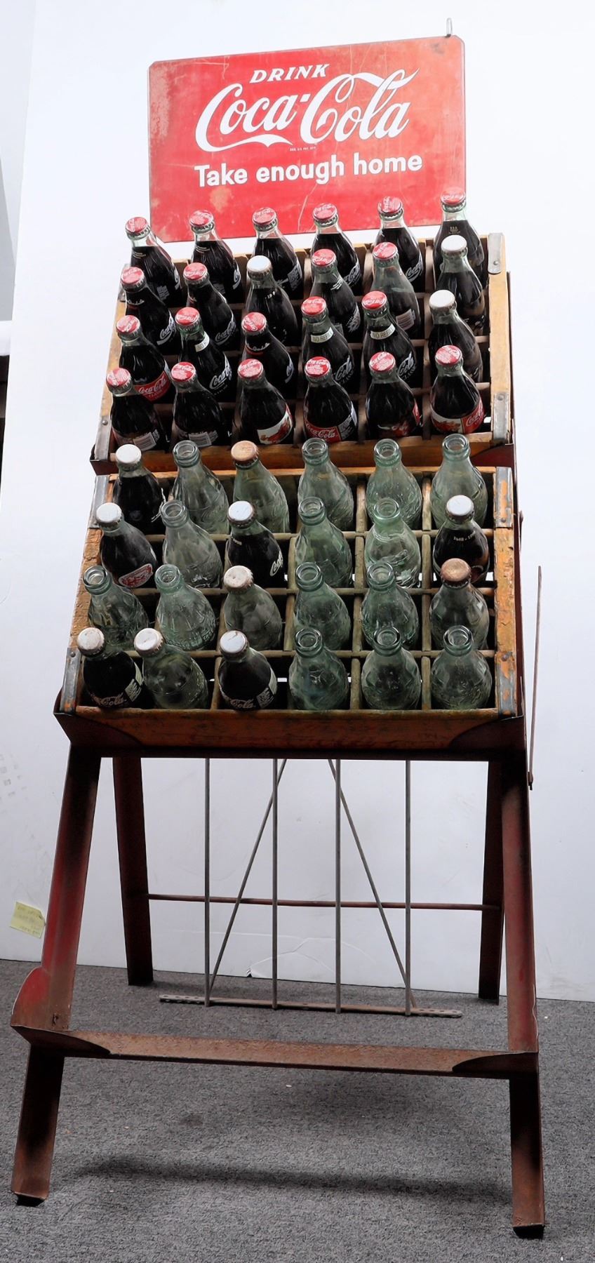 Lot of 3. Two cases: 48 bottles of Coca Cola. Some Empty, Some Full. Good Condition. Original Coca Cola Stand to hold original wood cases of Coke Bottles in Fair Condition. Normal Wear. Includes: 150 Year Anniversary, Ole Miss Coca Cola Bottle, Commemorative Bottle 1996 Super Bowl, 1996 Commemorative Bottle Atlanta Olympics, etc. As best we can tell, here are what the commemorative Cokes are, all in good condition. those in bad condition are not listed, and this inventory is only from the case with full bottles: