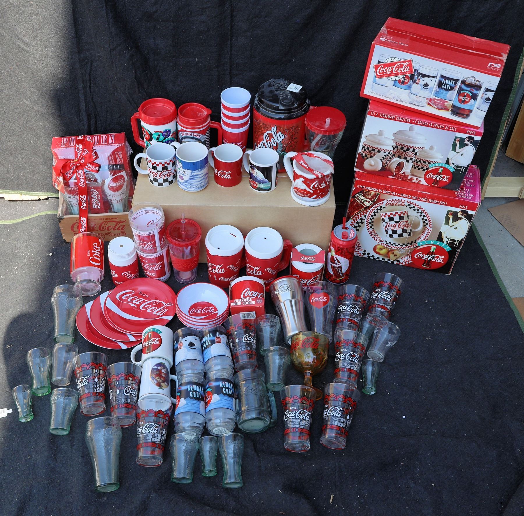 Nice assortment of Coca Cola items. New in box 12 piece dinner ware set, plastic beverage drinking containers, coffee mugs, glasses and more. About 60 pieces, maybe more.