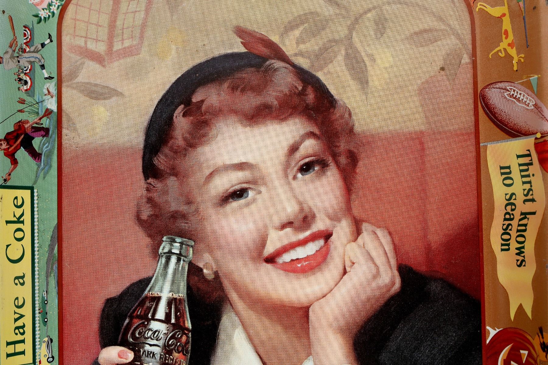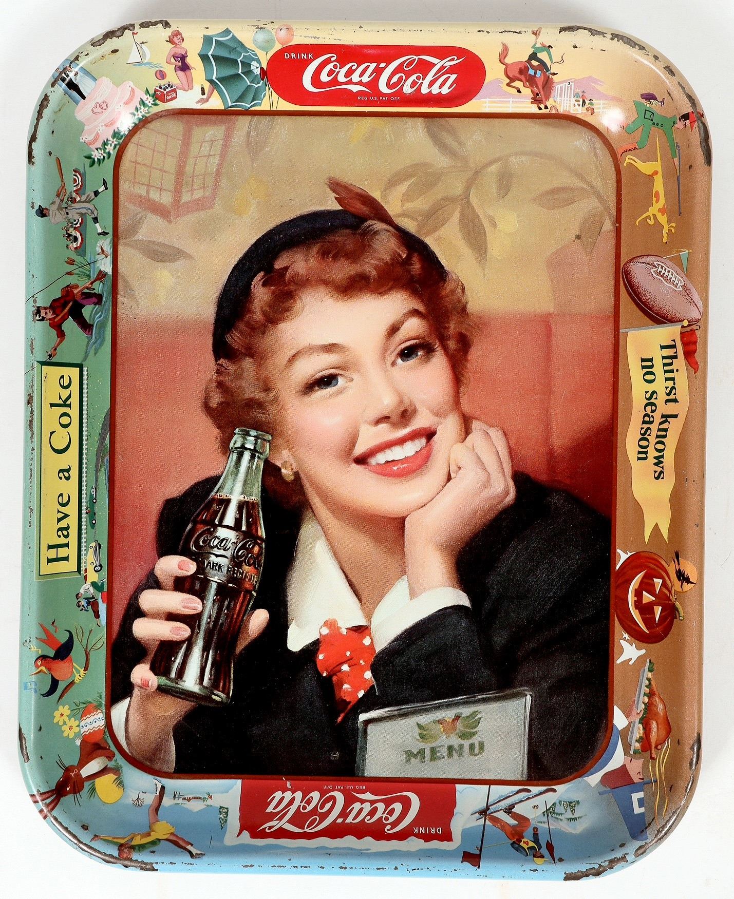 c. 1950's Coca Cola Menu Girl serving tray. 13x10.5". Edge wear on top and bottom.