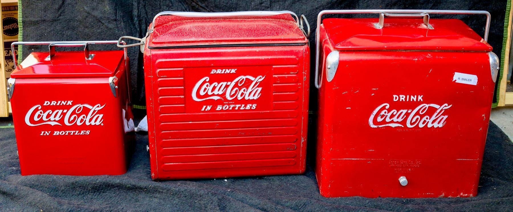 3 different Coca Cola metal carrier coolers. 12x12.5x9", 19x17x12" and 17x18x12.5.