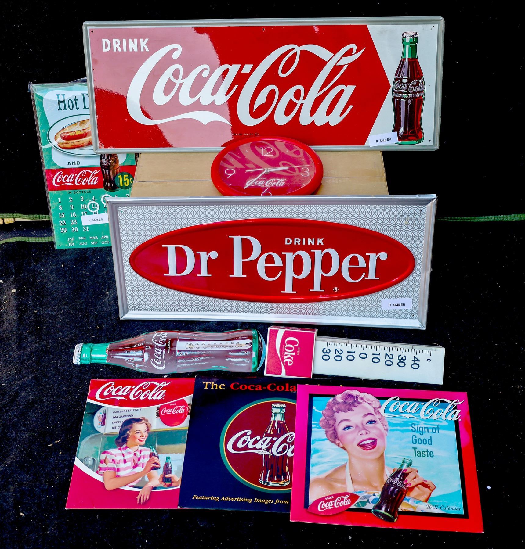 Lot of 9. 1) Metal sign. Drink Coca Cola. 12 x 32" 2) Metal sign. Drink Dr. Pepper. 12 x 27" 3) Metal sign calendar. Hot dog and Coca Cola. 16 x 8.5" 4) Coca Cola thermometer. 15" 5) Coca Coal clock. 6) Coca Cola thermometer in shape of bottle. 16" 7) Three Coke calendars. 2001, 2007, 2008.