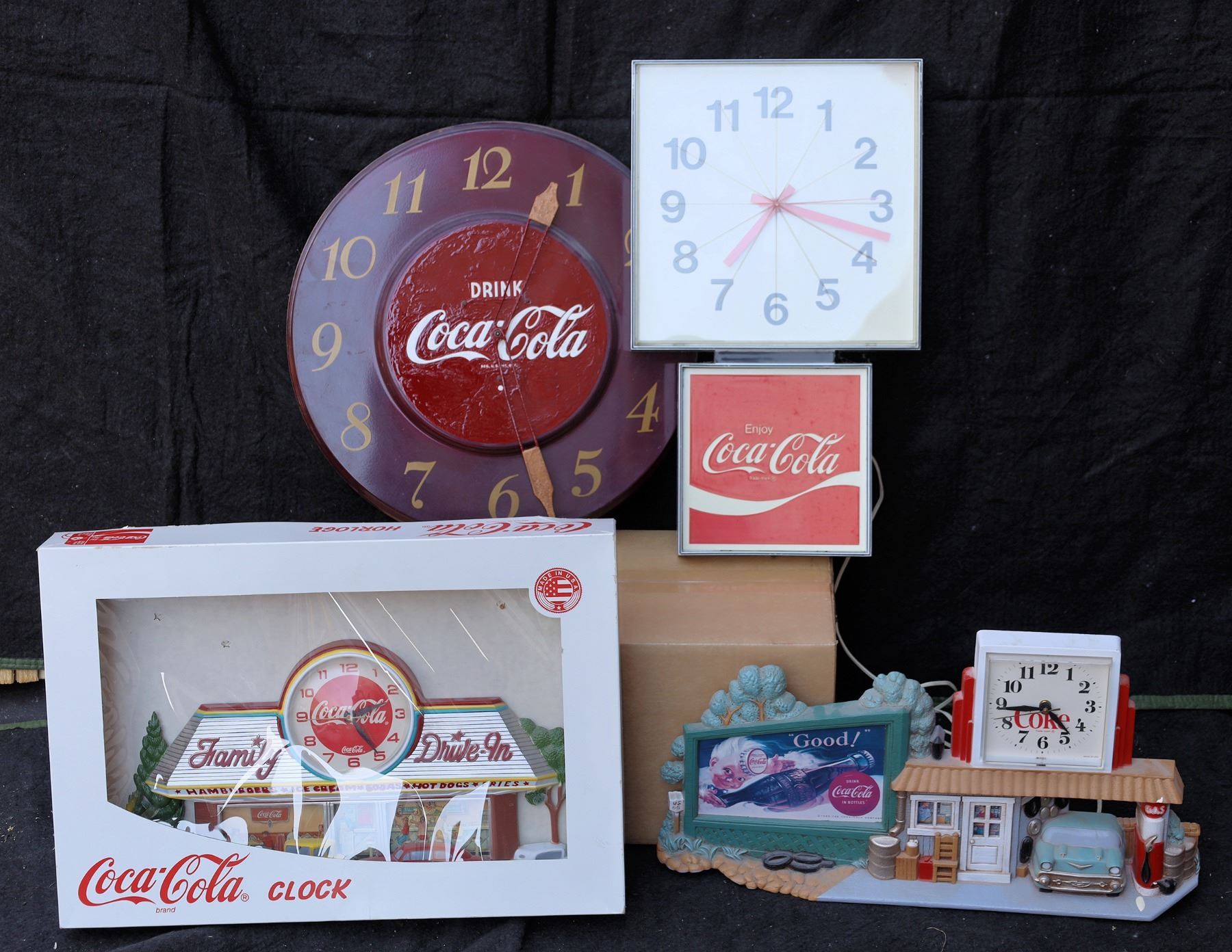 4 different Coca Cola wall clocks. Plastic Route 66 gas station with 2 paint splashes, 11.5x22". Vintage round metal clock 18". Plastic 2 level clock 20x12". New in box Family Drive-In 10x20".