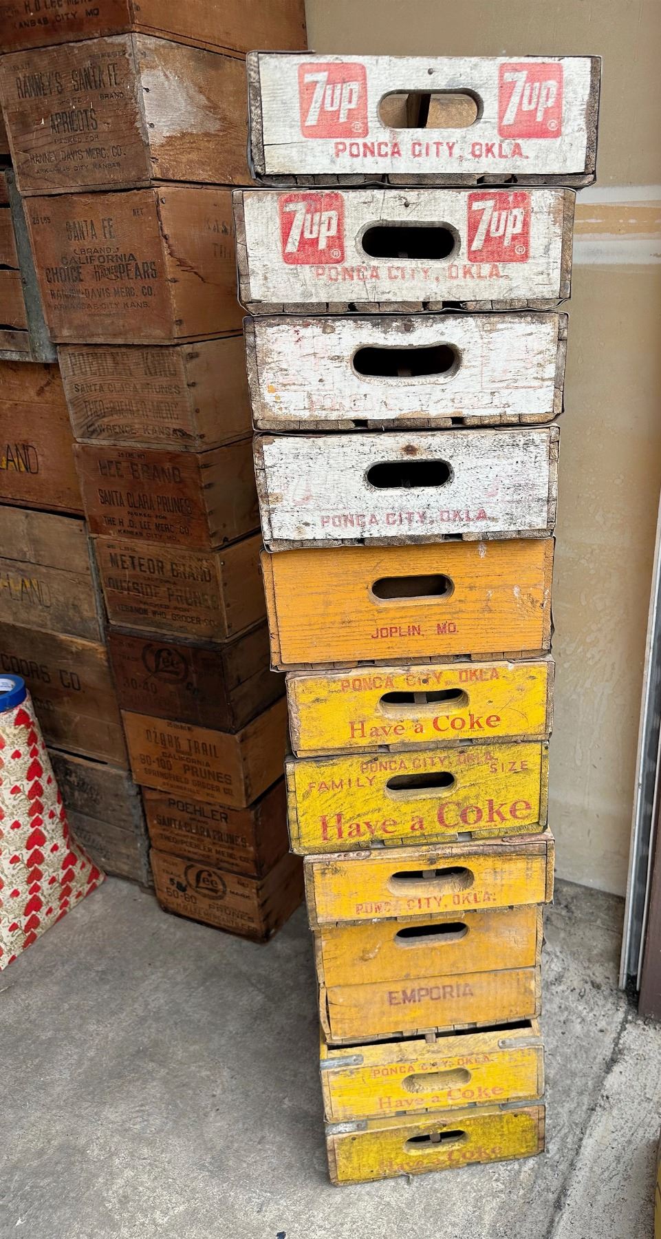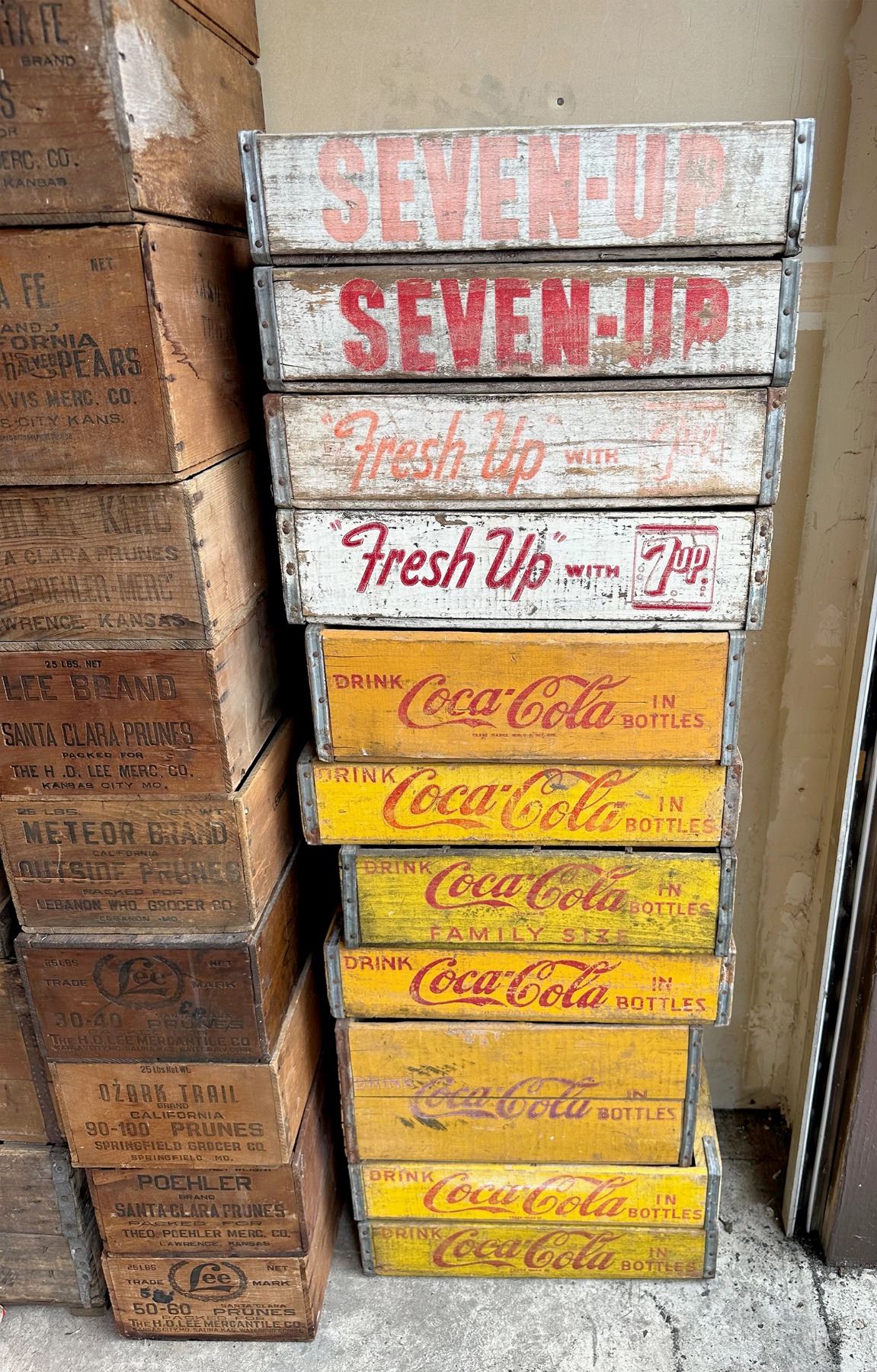A stack opf eleven vintage soda bottle boxes. Two sizes of the Coke boxes, all with red on white: 5 x 17 x 12" (2); 9 x 17 x 12" (1). 18 x 12 x 4" (4). 7 Up: 18.5 x 12 x 4" (4); Circa 1920-1940. Bracken Collection. Oklahoma