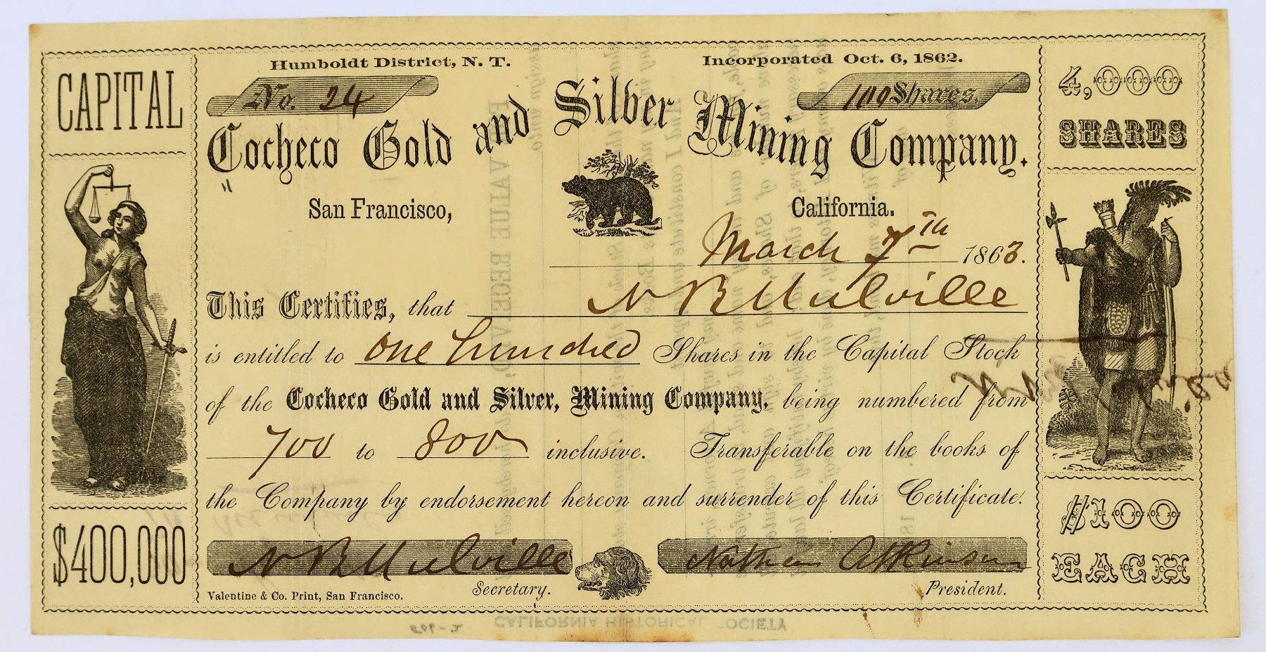 Located at Columbia, Humboldt County. This company was incorporated in the more desirable year of 1862. # 24 for 100 shares to N. B. Mulville (Reverse has divided the stocks as 30 to Lynch and 70 to Mulville.) Signed by N. B. Mulville (Society of California Pioneers) and president Nathan Atkinson. Dateline San Francisco March 7, 1863. Incorporated October 6, 1862. Not cancelled. Allegorical vignettes. Valentine & Co Printer. Location Humboldt District, N. T. Small light discoloration about the cert. The Daily Alta California on January 22, 1863 reported, "A RICH LEAD - We were yesterday shown a button, the yield of crushing some of the Cocheco Gold and Silver Mining Co's rock, accompanied with a certificate that it assays $239.90 to the ton. The lead is located in Florida Canon, Humboldt County, Nevada Territory. The company also had a mill site, with seventy feet fall of water. The article stated that the company intend erecting a mill as soon as the weather will permit next spring. The Humboldt District is near present day Imlay in Pershing County. [Mining Districts of Nevada by Tingley] Columbia, Humboldt Nevada Joe Elcano Nevada Mining Stock Collection