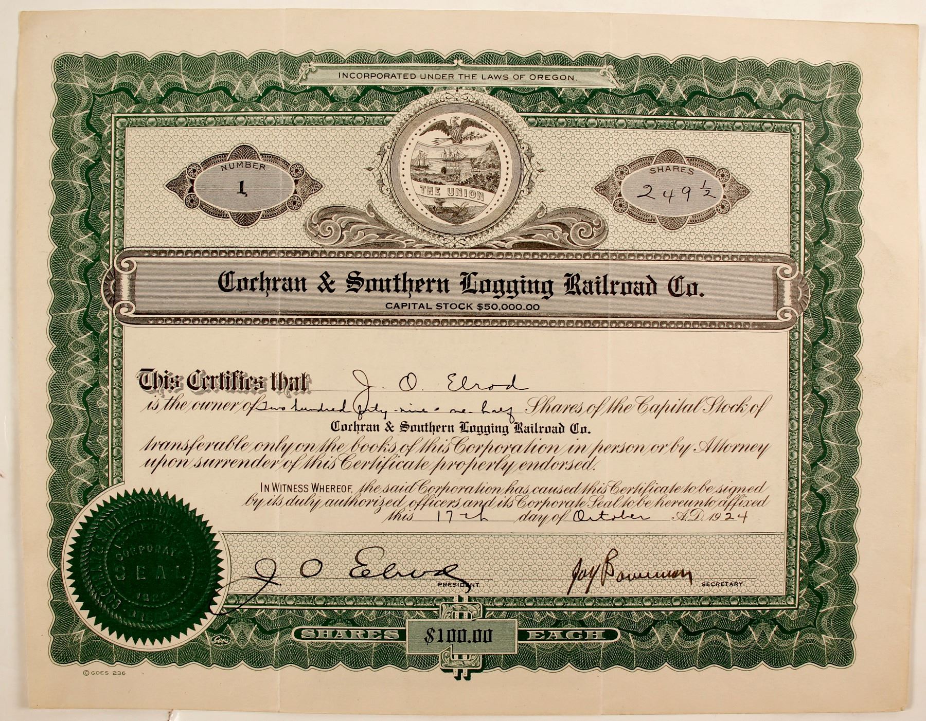 Certificate #1 for 249 1/2 shares of Capital stock, issued on Oct. 17, 1924 to Company President J. O. Elrod. Uncancelled. Unlisted in Cox. Green seal is stamped with the company's seal.