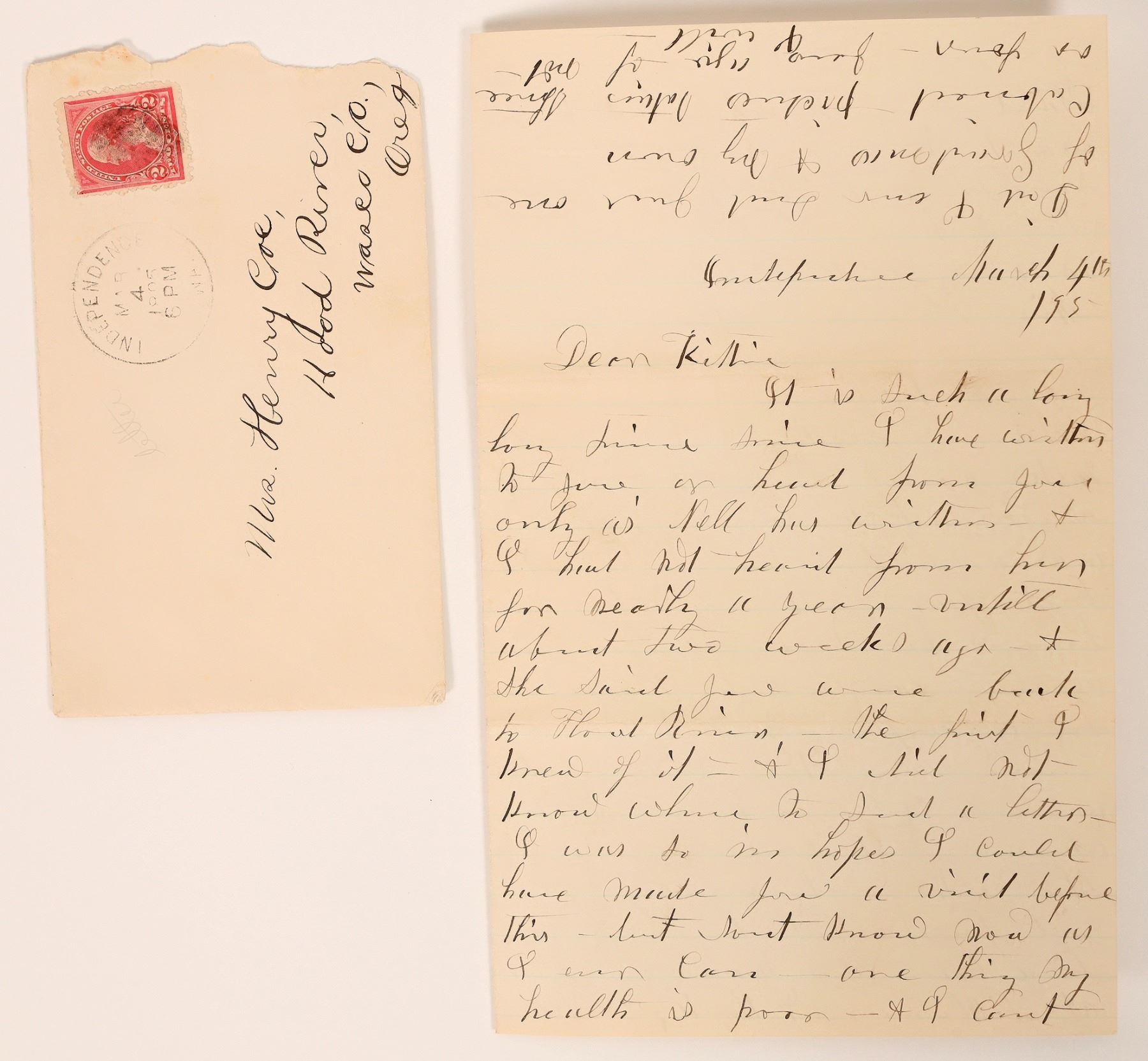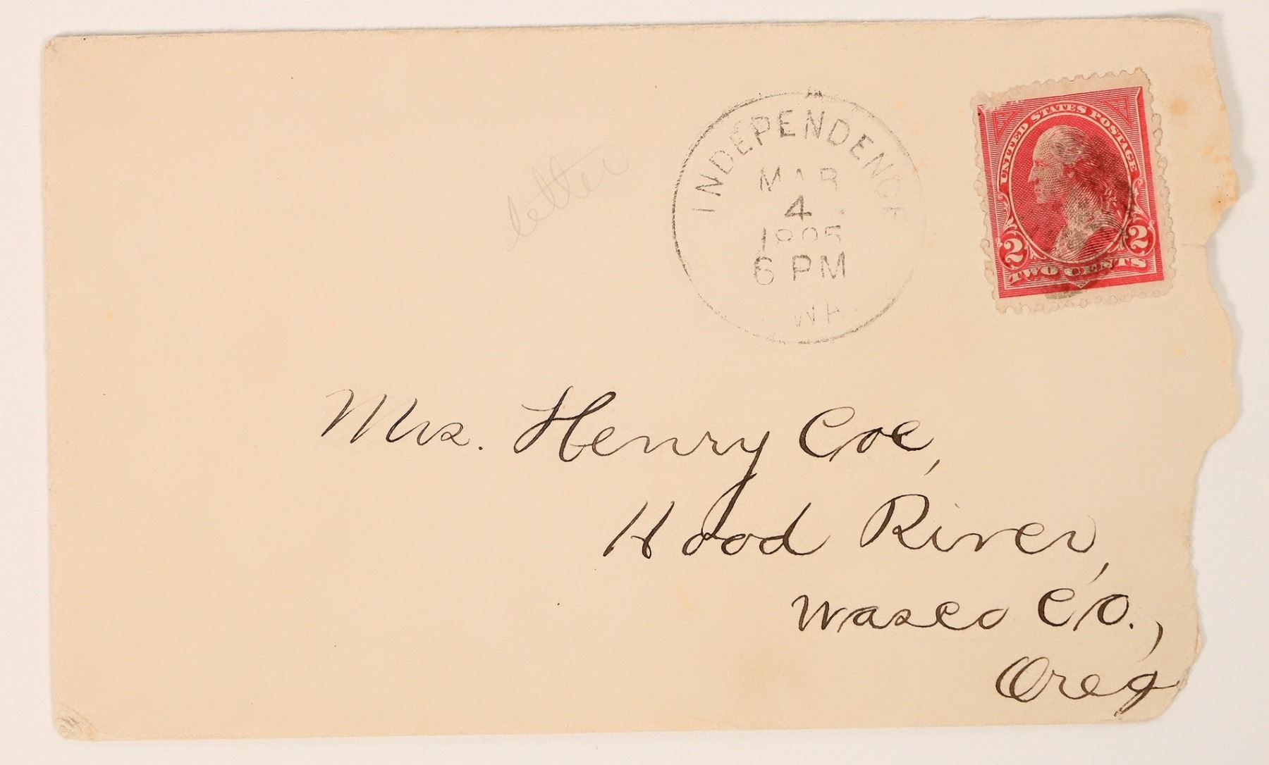An 1895 letter written by a woman identifying herself as 'Aunt Alithea' of Independence, Washington to Mrs. Henry Coe of Hood River, Oregon. In the letter, Alithea updates Mrs. Coe on the goings-on of her family, including illness, relocation, and the birth of children, among other topics. The Coes are recognized as the first non-native settlers of Hood River, tying this letter to a notable moment in Oregon history. The letter is handwritten, and its envelope is included.[ Independence Washington