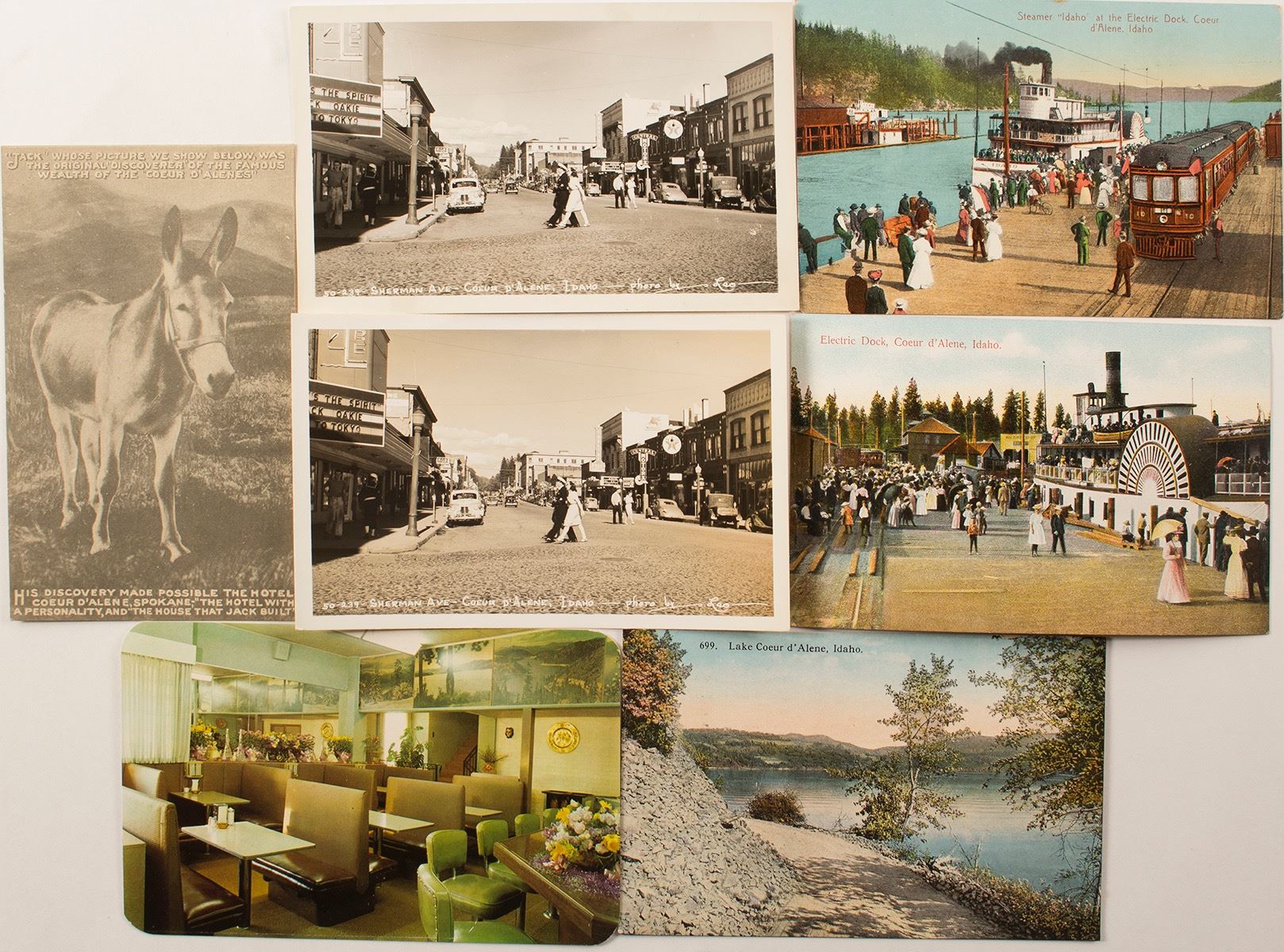 Lot of seven. Two duplicate RPC's of street scene. Also Fowler's Restaurant, Sherman Avenue, the lake, dock with steamers and a famous donkey! Date: Location: Coeur d'Alene, Idaho HWAC# 54527