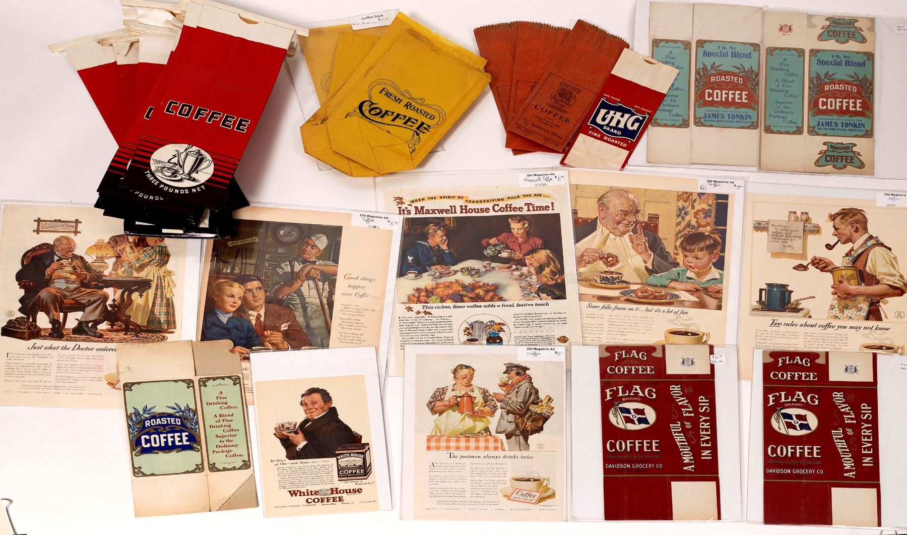 7 vintage coffee magazine ads, 5 flat coffee boxes, 33 unused coffee bags with 4 varieties.