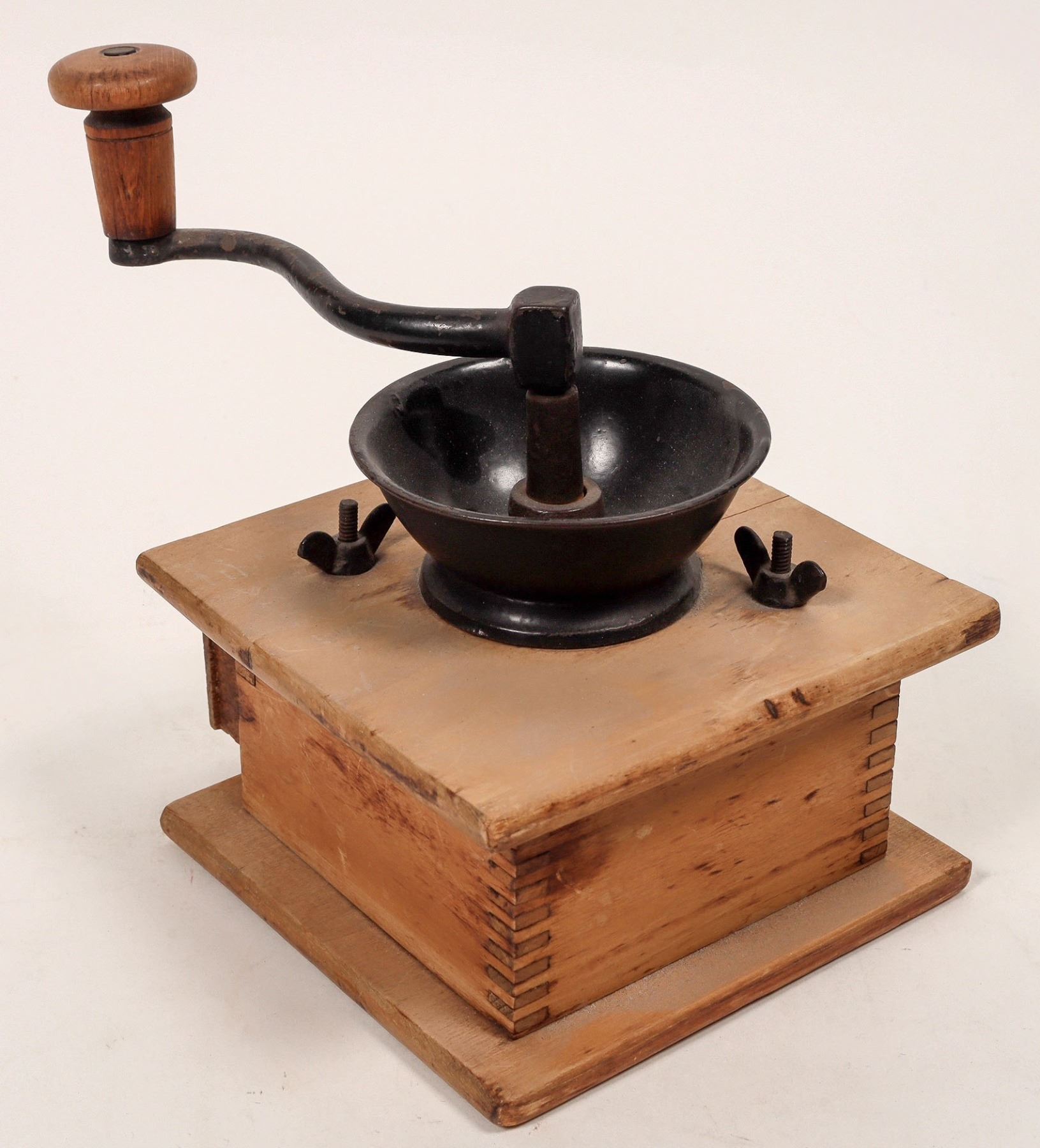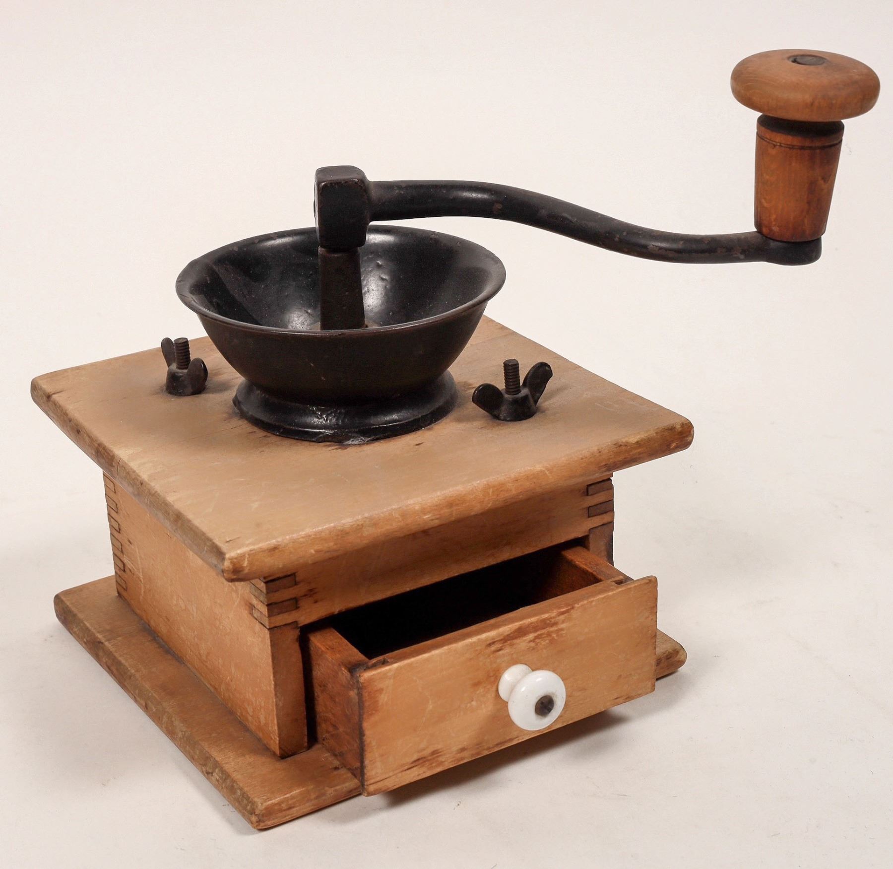 Small vintage hand crank coffee grinder. Wood base with drawer and white knob. 8" tall.