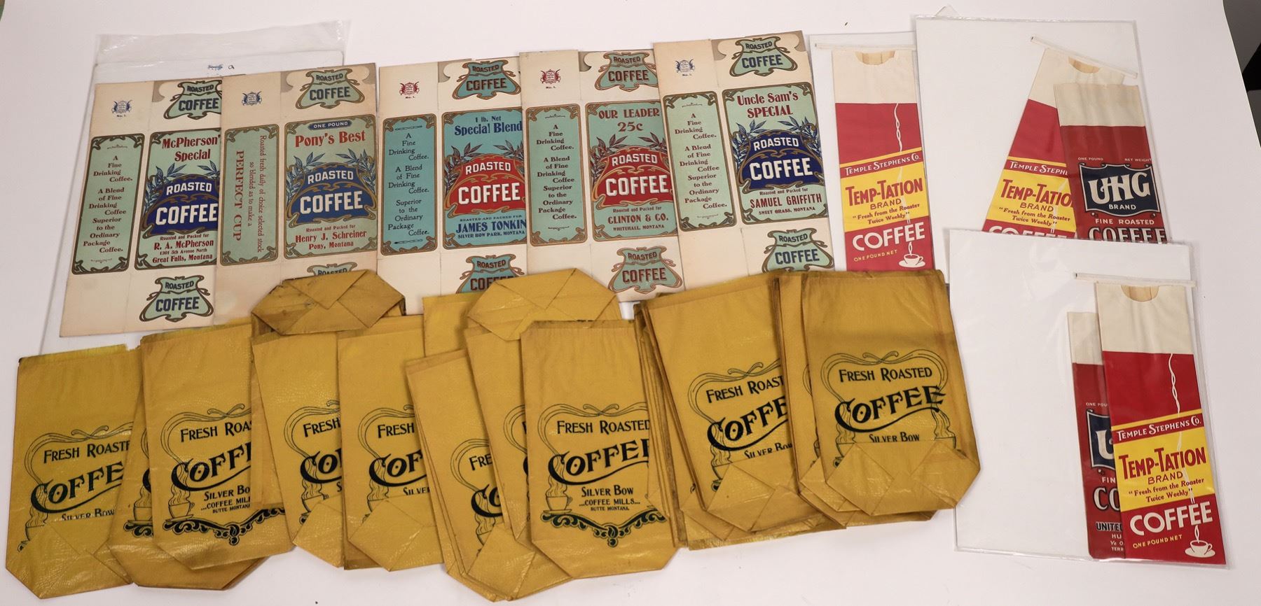 Group of bags and boxes from various coffee manufacturers. About 30 bags from the Siver Bow Coffee Mills in Butte Montana, three bags for Temple-Stephens Co. Temp-Tatian Brand Coffee, two bags for UHG Brand Fine Roasted Coffee, and five flattened boxes for McPherson's Special Roasted Coffee from Great Falls, Montana. These coffee containers are varying sizes, between 3.5 x 9.25 and 6.5 x 11.75. All good condition. This is a dealer lot. City: State: Date: c. 1910-1940