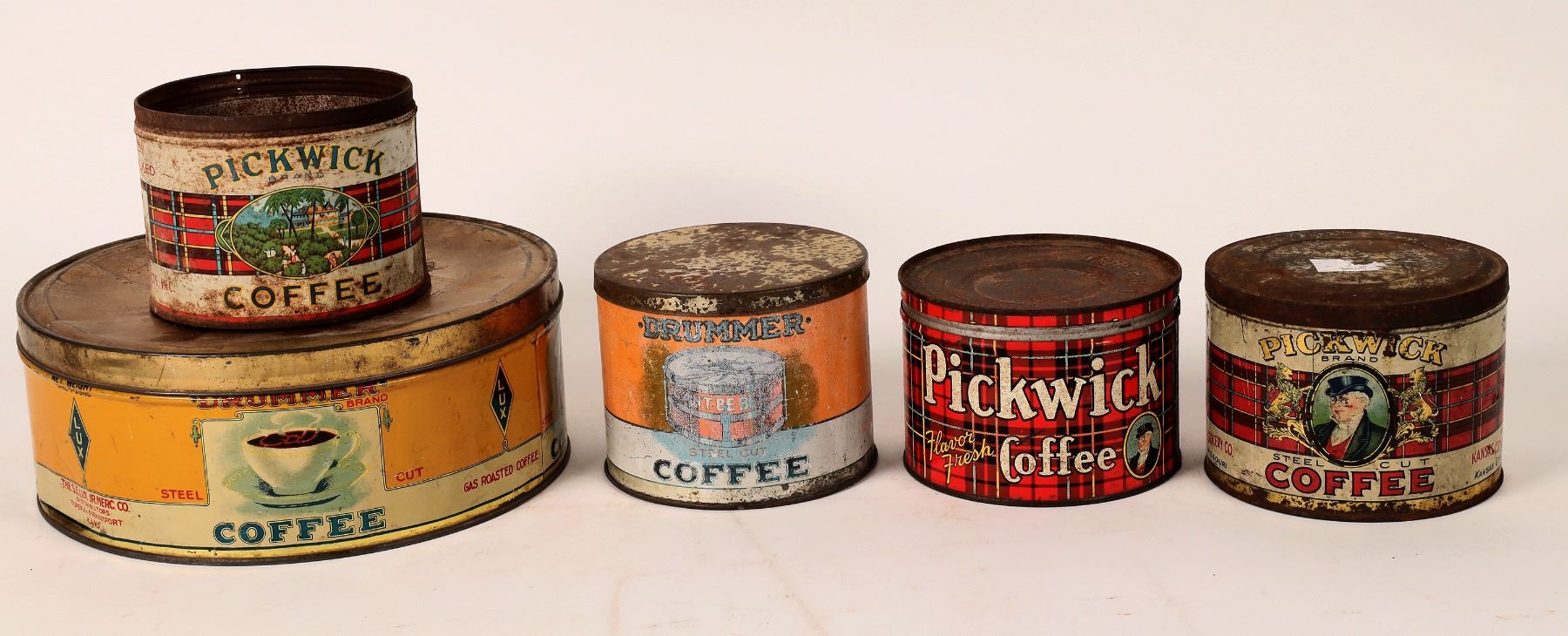 5 coffee tins, up to 3.75" tall. 3 different Pickwick-all have some rust. Drummer Brand with Can't Be Beat drum logo-small has fading, big has dents. Gary Bracken Collection