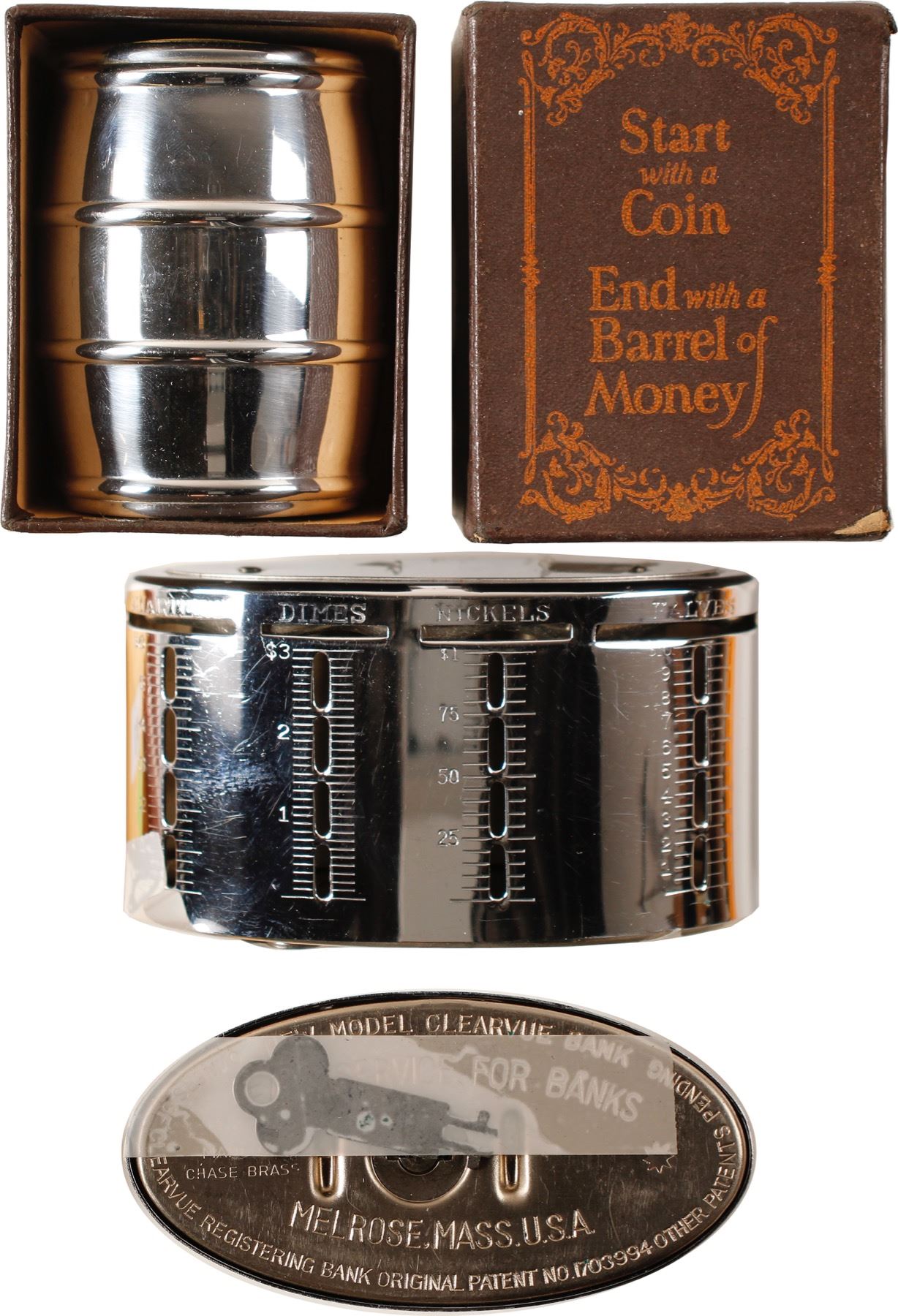 Lot of two: "Start with a Coin / End with a Barrel of Money," 3 inch tall metal barrel, patented in 1923 by the Chicago Thrift Company, in original box. Clearvue Bank made of chase brass from Melrose, Massachusetts. A slot in back for bills, slots in front for quarters, dimes, nickels and halves. Oval, four inches long and 2 1/2 inches tall, key included. State: City: Date: HWAC# 84737