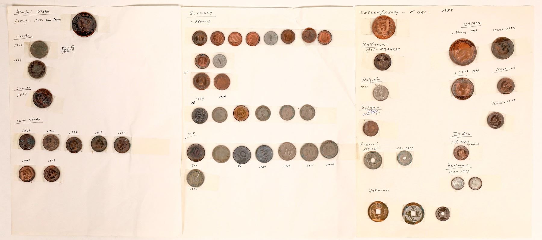 Here's an interesting coin collection: coins scotch taped to 8 x 10 typing paper. The first page is United States: Large cent (1817); Shield nickel (1868); Liberty nickel (1884); two cent piece (1864); Indian Head Pennies (7: 1865, 1861, 1873, 1878 1882, 1906, 1907. Page two: German coins: one, two, five and ten pfennig. 26 coins dated from 1896 through 1950. Page three: 17 coins from various countries: Sweden, Belgium, France, India, Canada and several marked "unknown."