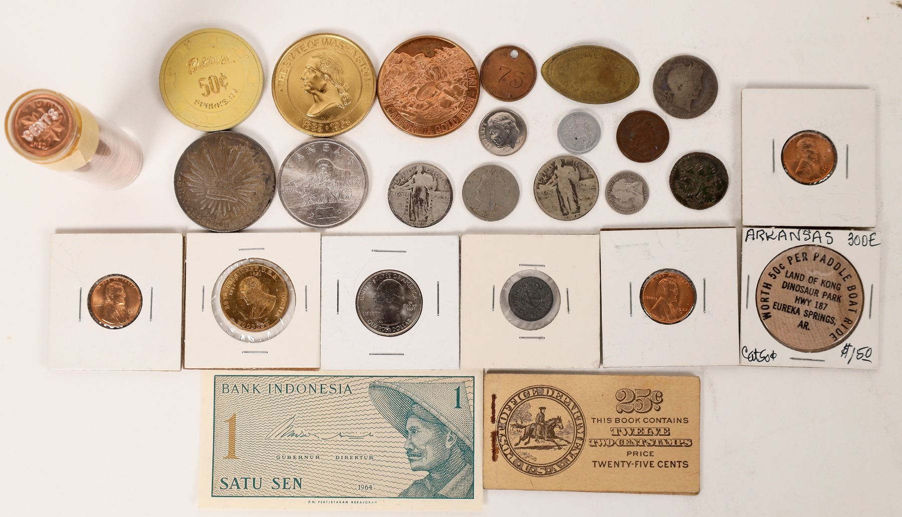 One BU roll of 1960 Canadian cents; three BU 1937-D Lincoln cents; 1961 Kansas Statehood Cetnennial; 50c poker chip Baldini's Sparks, Nevada; empty booklet of two cent stamps; 1964 Bank of Indonexa 1 Satu Sen note; California gold rush Centennial copper medal; Kansas tax token; 1969 State of Washington medal; Woodrow Wilson medal; 1898 three pence coin from Great Britain; 2010 BU Yosemite National Park quarter. Five metal detected coins: two Standing Liberty quarters, Barber quarter, 1912 Liberty nickel, 1883 Mexican eight reales.