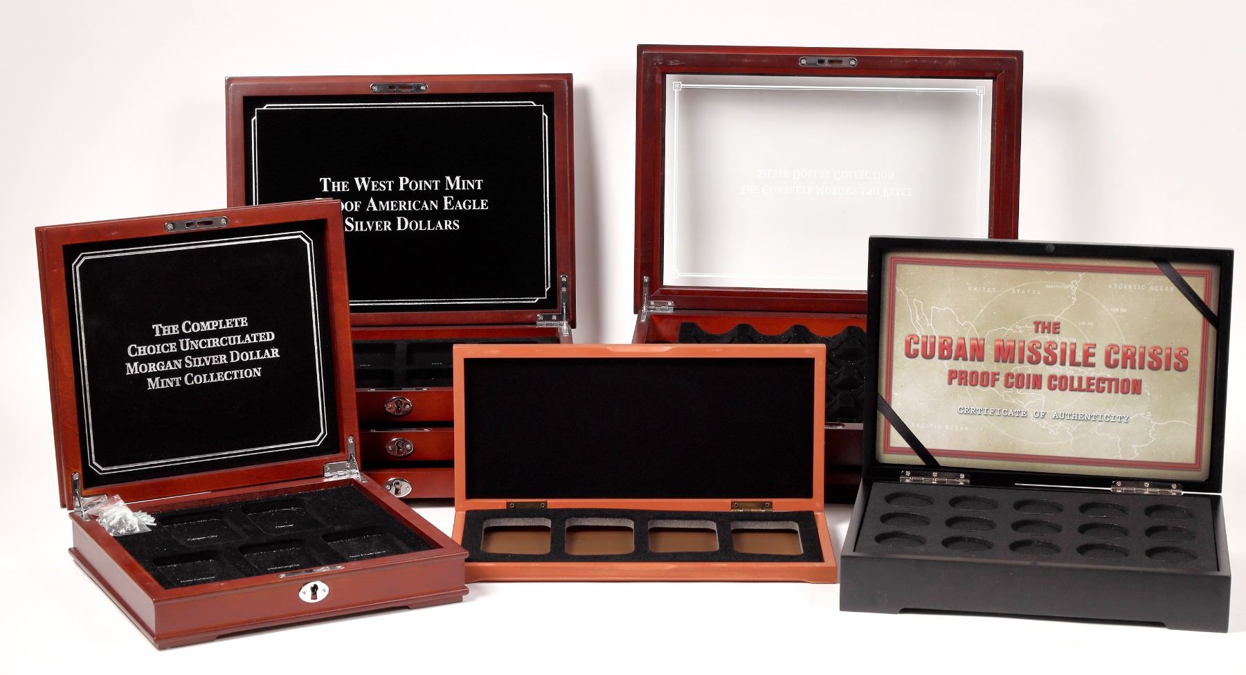Five wooden cases for coin collections. (No coins included). 1) By PCS Stamps and Coins: "The Complete Morgan and Peace Silver Dollar Collection, glass topped, 15 x 11 x 6 inches, one drawer. 2) By PCS Stamps and Coins: The West Point Mint Proof American Eagle Silver Dollars; 14 x 10 x 5 inches, two drawers, designed to hold slabbed coins. 3) Light brown case, 13 x 6 x 1 inch, for four slabbed coins. 4) Black box, 12 x 8 x 2 inches, to hold 15 medals, 40 mm in size. 5) By PCS Stamps and Coins: The Complete Choice Uncirculated Morgan Silver Dollar Mint Collection; 10 1/2 x 9 1/2 x 3 inches, with room for five slabbed coins (one from each mint).