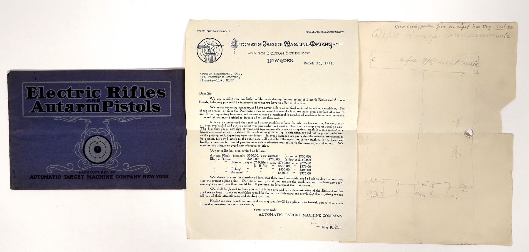 c. 1921 Automatic Target Machine, Electric Rifles and Autarm Pistols 18pp catalog with detached center page. Also, hand drawn rifle range diagram in fair condition and 1921 manufacturer letter.