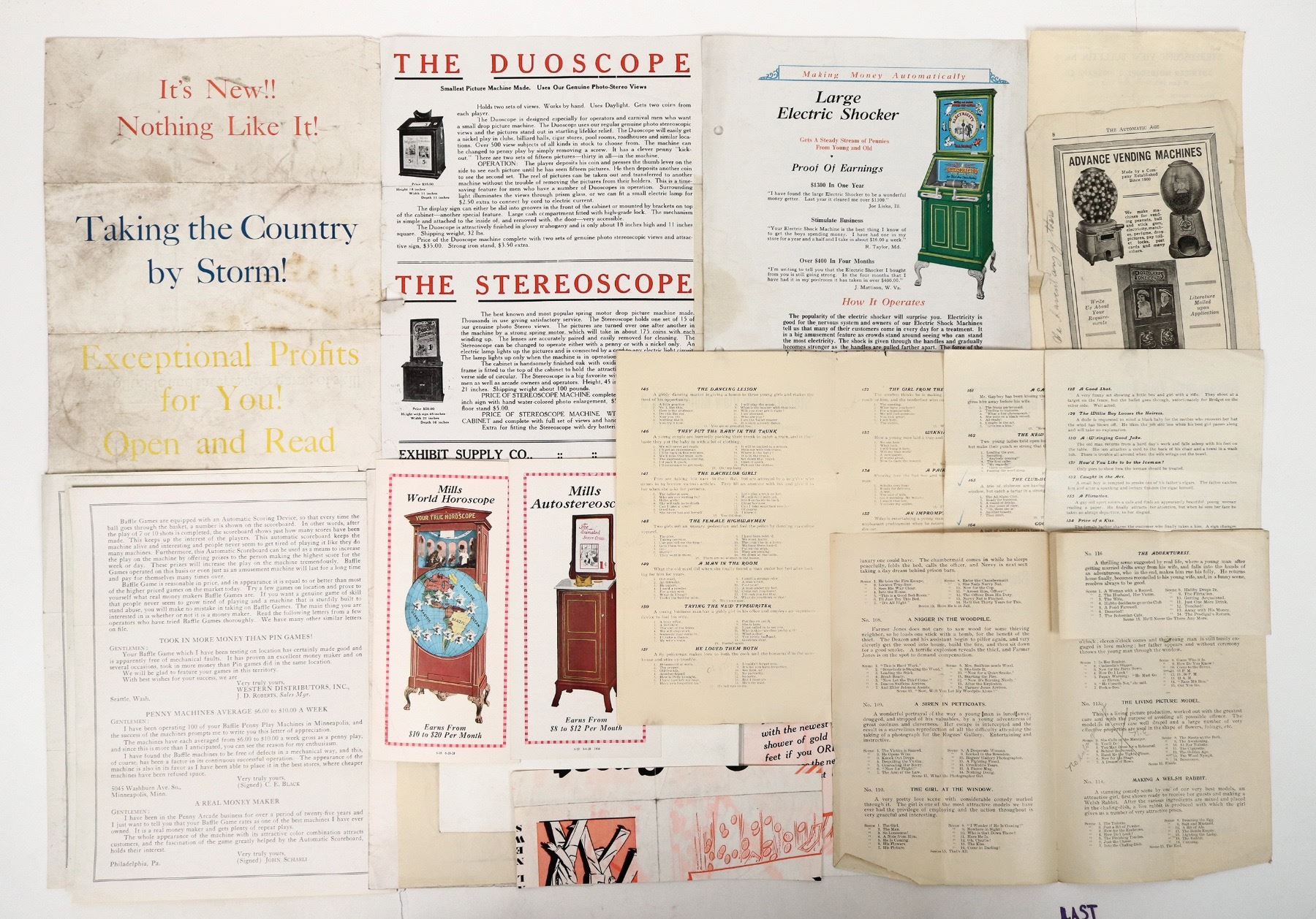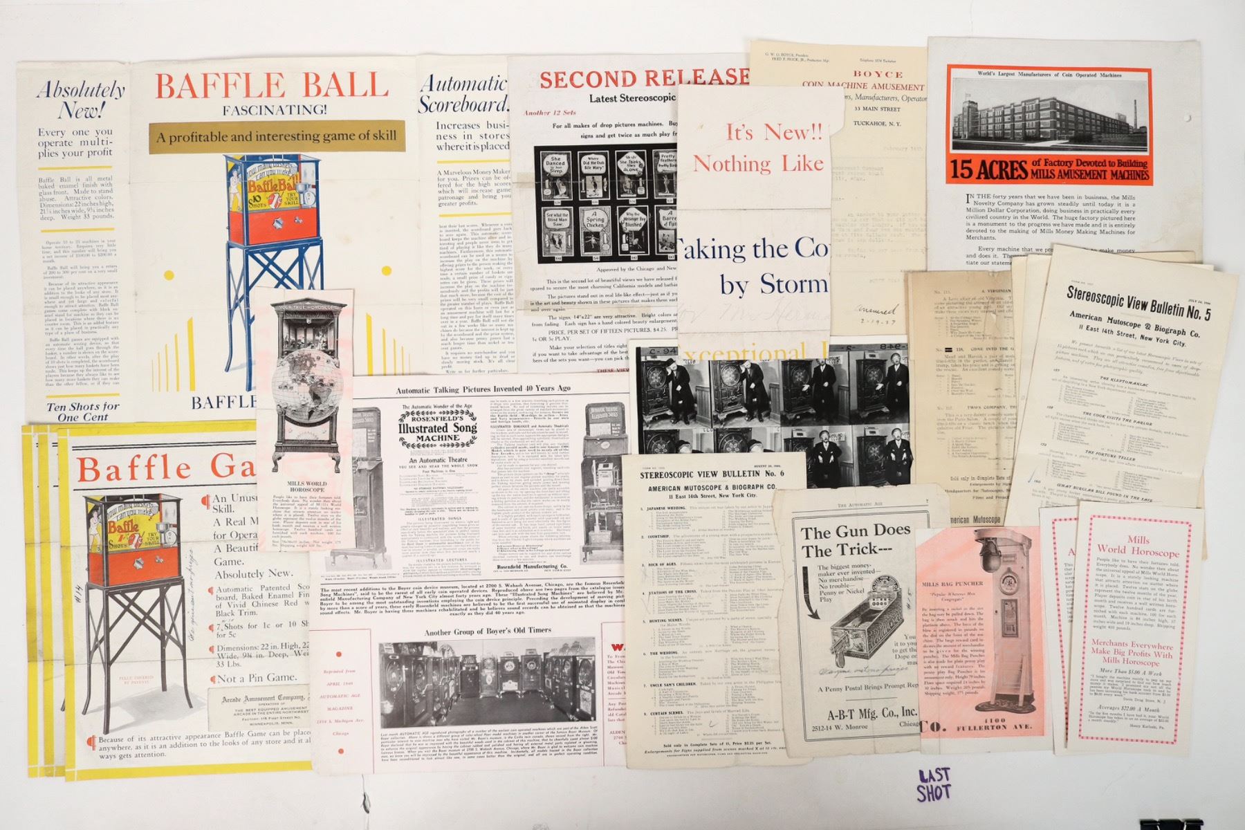 5x Baffle Ball and Baffle Game, Exhibit Supply-fair condition, Gambling Club 12 photo card, music machine reprint, ads, bulletins, pictorial letterhead, Mills Bag Puncher and Autostereoscope, Large Electric Shocker!